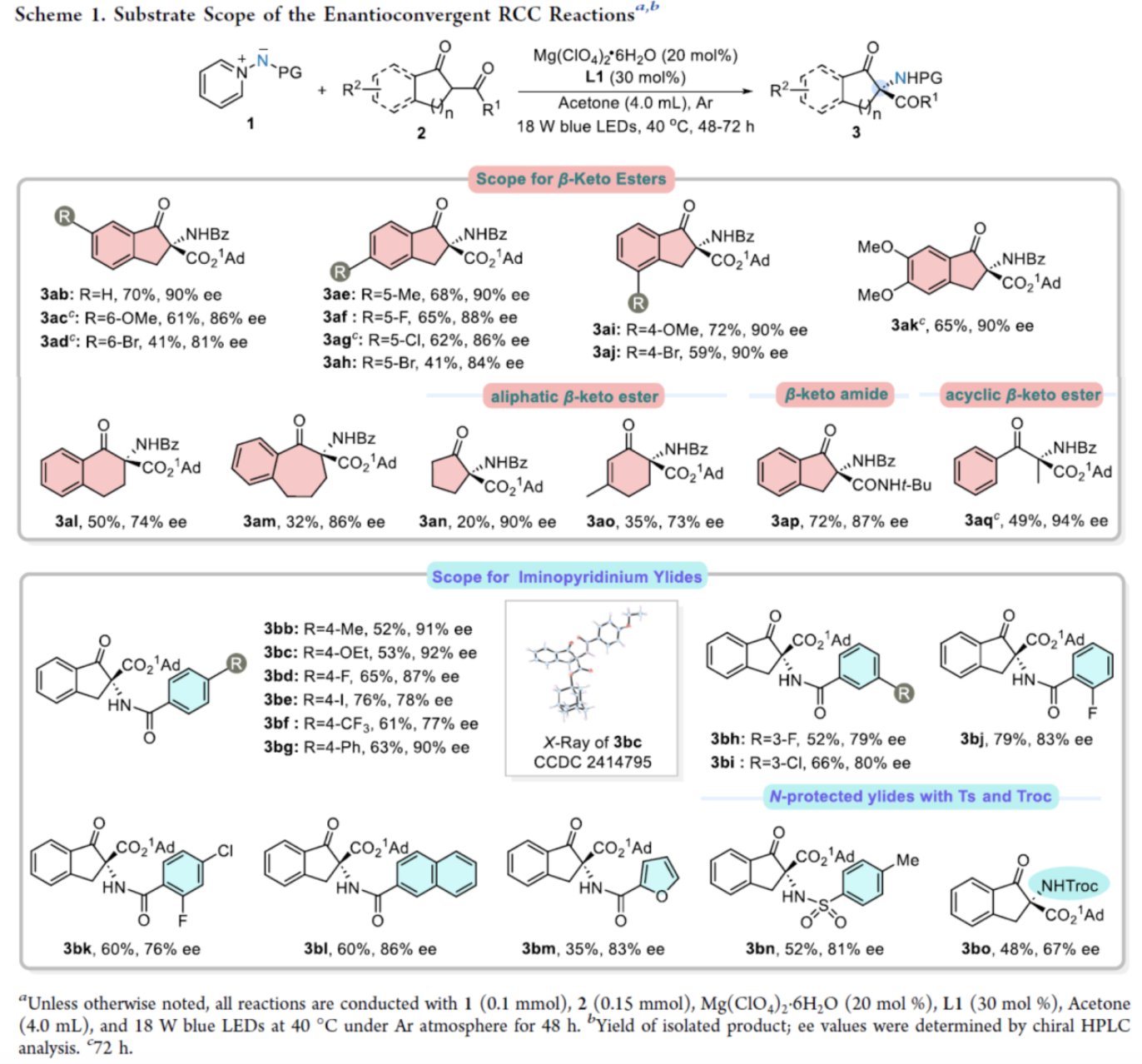 近日,兰州大学的许鹏飞课题组在J. Am. Chem. Soc.中发表论文,报道一种创新且高效的不对称光化学双功能催化体系,该体系在可见光照射下采用镁盐与手性PyBOX-型(pyridinebisoxazoline)C2-对称配体的组合。该方法通过氮中心自由基机理驱动β-酮酯衍生物的选择性α-酰胺化,促进了具有全取代立体生成中心的β-酮氨基酸衍生物的合成。该反应展现出良好的收率(高达79%)与优异的对映选择性(高达94%)。该催化过程通过原位形成前手性四元电荷转移配合物进行,此类配合物能促进Lewis酸辅助的自由基生成,从而介导后续的对映汇聚式自由基-自由基交叉偶联反应。值得注意的是,β-酮酸酯衍生物在此过程中发挥三功能作用(即光敏剂、还原剂和自由基前体),而N-保护iminopyridinium叶立德则同时充当氧化剂与氮中心自由基前体。实验与计算机理研究共同证实了该对映汇聚式自由基-自由基交叉偶联过程。
