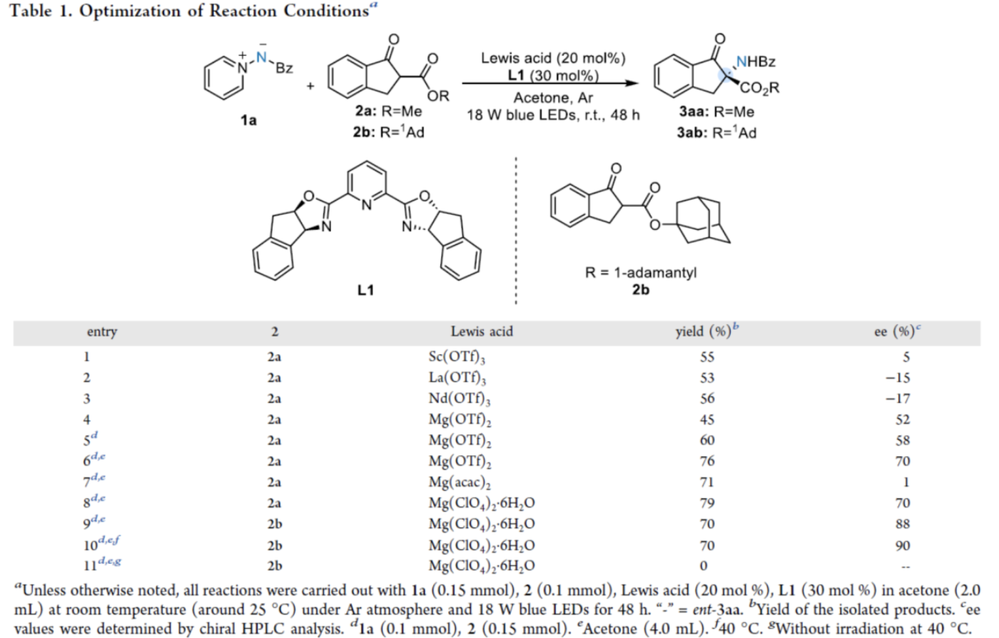 首先,作者采用叶立德衍生物1a与β-酮酯衍生物2a作为模型底物,进行相关反应条件的优化筛选 (Table 1)。采用Mg(ClO4)2·6H2O作为Lewis酸催化剂,L1作为手性配体,18 W蓝色LEDs ( λmax = 460 nm)作为光源,在丙酮反应溶剂中,反应温度为室温,可获得79%收率的产物3aa(70% ee)。同时,采用β-酮酯衍生物2ba作为底物,将反应温度提高至40 oC,可以70%的收率的产物3ab(90% ee)。