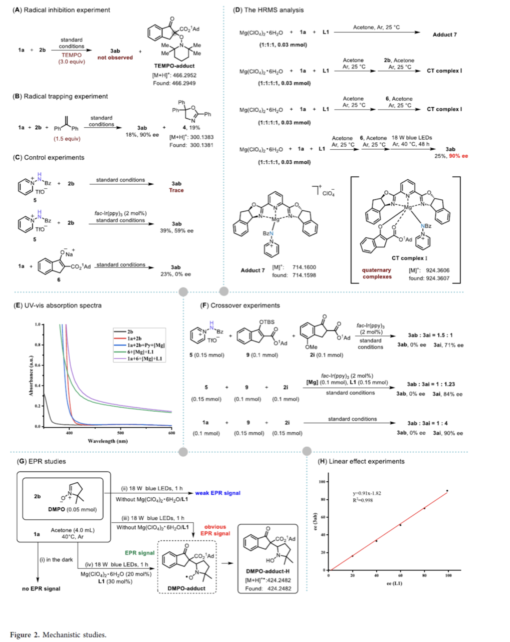 之后,作者对上述对映汇聚式自由基-自由基交叉偶联过程的反应机理进行进一步研究(Figure 2)。首先,自由基抑制实验结果表明,反应涉及α-羰基自由基中间体的形成(Figure 2A)。自由基捕获实验结果表明,反应形成了一种以氮为中心的自由基物种,而不是氮宾自由基阴离子(Figure 2B)。其次,控制实验结果表明,反应存在两种竞争性的路径:(i)手性镁-烯醇配合物对游离氮中心自由基的外球立体控制性捕获;(ii)游离氮中心自由基与游离烯醇盐之间的非选择性副反应。该结果凸显了内球机理的关键作用,其将两种不同自由基稳定在手性镁配位域内,从而抑制非选择性副反应。同时,当以化合物6替代2b时,虽能生成产物3ab但完全丧失对映选择性,溶解度引发的配位约束使6无法参与内球催化循环(Figure 2C)。HRMS分析研究表明,在反应过程中形成了短寿命的前手性四元配合物(Figure 2D)。UV-vis吸收光谱的研究,反应涉及前手性四元电荷转移配合物的形成(Figure 2E)。交叉实验结果表明,烯醇盐与叶立德必须同时配位于手性镁催化剂,这是实现高对映选择性的关键机理(Figure 2F)。EPR研究结果表明,化合物1a引发烯醇盐的光致电荷分离,从而生成碳中心自由基。同时,化合物2b与镁之间的配体交换过程,该过程对电荷转移配合物的形成及内球机理的实现具有决定性作用(Figure 2G)。线性效应实验表明,在立体控制成键步骤中,仅单个手性镁催化剂分子参与反应(Figure 2H)。
