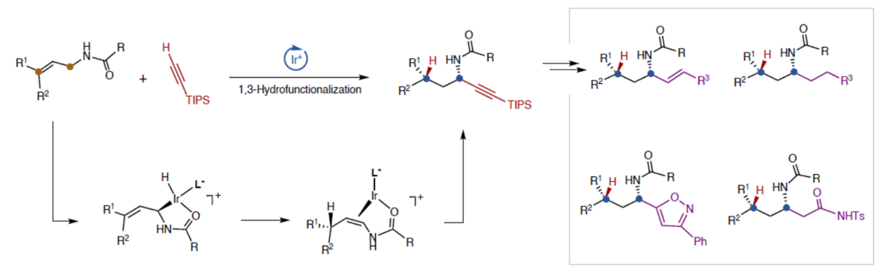 近日,清华大学的李必杰课题组在Nat. Chem.中发表论文,报道一种全新的非活化三取代烯烃的催化1,3-氢官能团化反应,合成了含有α与γ立体中心的产物。烯烃上的酰胺基首先导向催化剂对亚甲基C-H键进行对映选择性断裂,通过C-H键移位形成烯丙基立体中心。同时,该酰胺基持续结合于金属中心,继而导向催化剂对新生成的烯烃进行高度区域与立体选择性氢官能团化反应。这种“导向接力”策略中的分级立体控制,实现了1,3-氢炔基化产物的立体发散性合成,其中所有四种可能的立体异构体均能以优异的非对映与对映选择性制备。