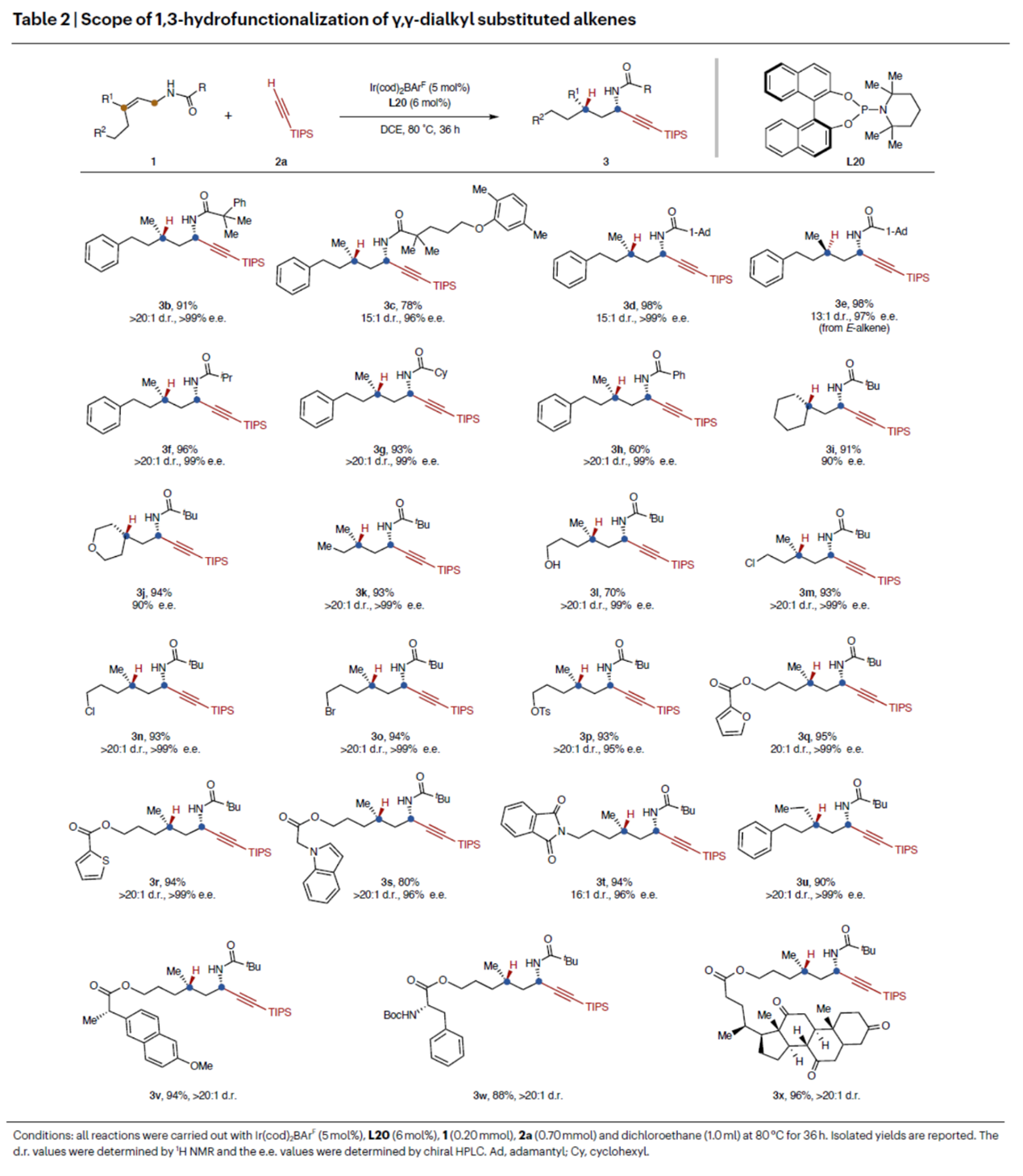 在上述的最佳反应条件下,作者对γ,γ-二烷基取代的烯烃底物范围进行了扩展(Table 2)。首先,当底物1中的R为不同的烷基、环烷基与芳基时,均可顺利进行反应,获得相应的产物3b–3h,收率为60-98%,dr为13:1->20:1,ee为96->99%。其次,当底物1中的烯基末端为环烷基时,也能够顺利进行反应,获得相应的产物3i(收率为91%,ee为90%)和3j(收率为94%,ee为90%)。此外,当底物1中的R2为各种烷基时,也与体系兼容,获得相应的产物3k–3x,收率为70-96%,dr为16:1->20:1,ee为95->99%。值得注意的是,该策略具有出色的官能团耐受性,一系列活性的基团(如羟基、卤素、烷氧羰基等)均与体系兼容。然而,对于四取代烯烃,未能有效的进行反应。