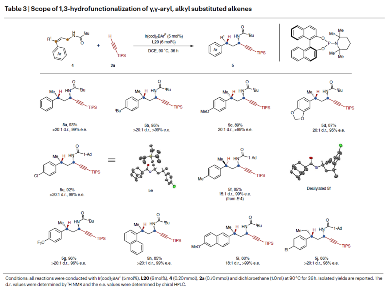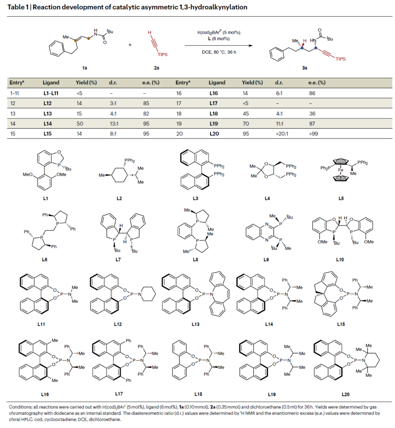 首先,作者采用烯丙基酰胺衍生物1a与末端炔烃2a作为模型底物,进行相关反应条件的优化筛选 (Table 1)。进而确定最佳的反应条件为:采用Ir(cod)2BArF作为催化剂,L20作为手性配体,在DCE反应溶剂中,反应温度为80 oC,最终获得95%收率的产物3a(>20:1 dr以及>99% ee)。
