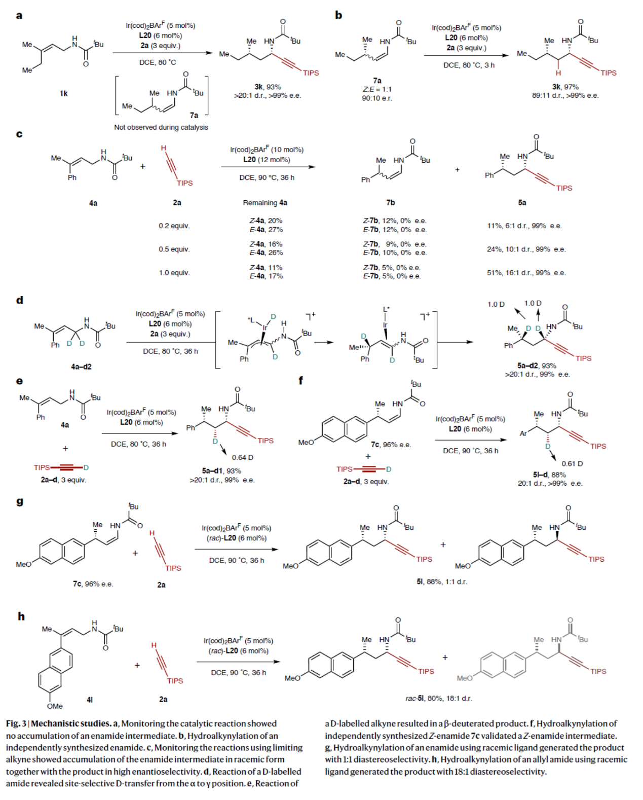随后,作者对反应的机理进行了研究(Fig. 3)。首先,在标准条件下,通过对1k的反应结果监控发现,在催化过程中未能观察到烯酰胺中间体7a(Fig. 3a)。同时,当以7a(Z/E为1:1)作为底物进行反应时,反应可顺利进行,具有高度的对映选择性,表明了氢炔基化过程具有高度的立体控制性(Fig. 3b)。同时,上述结果进一步支持了烯酰胺可作为1,3-氢官能团化反应的中间体。其次,不同当量炔烃与4a的对照实验结果表明,一旦炔烃被消耗,烯烃异构化是一个可逆过程。随着炔烃2a当量的增加,产物5a的非对映体比例随之升高,表明烯烃异构化与1,3-氢炔基化反应之间存在竞争关系。当体系中存在更多末端炔烃时,后续的催化氢炔基化反应加速进行,从而驱使烯烃异构化的平衡不可逆地向产物生成方向移动。在此条件下,烯烃异构化逐渐转变为不可逆过程,因此烯烃异构化及其后续氢炔基化反应的立体选择性均得以有效控制(Fig. 3c)。在4a–d2的氘代实验中,氘选择性地从α位转移到γ位,表明烯烃异构化过程更符合π-烯丙基机理(Fig. 3d)。通过铱中心在α位发生区域选择性C-H氧化加成,继而在γ位发生C-H键形成的还原消除,这一连续步骤可解释氘代转移的位点选择性现象。在氘代炔烃2a-d的实验中,进一步支持π-烯丙基机理,烯酰胺是反应中间体(Fig. 3e)。由于氢炔化反应是一种立体专一性的顺式加成过程,作者可推断烯烃异构化生成的烯酰胺产物为Z构型。这一立体化学结论进一步得到了独立合成的Z-烯酰胺7c的对照反应验证(Fig. 3f)。最后,通过外消旋配体(rac)-L20进行的对照实验结果表明,烯酰胺并未从金属中心解离。由于烯烃异构化和烯酰胺氢炔基化两个反应步骤中,相同配体始终与金属中心结合,该配体在两步反应中分别实现的立体化学控制,从而能够实现高非对映选择性。此类反应模式是实现非相邻立体中心高度立体控制的关键(Fig. 3g和Fig. 3h)。