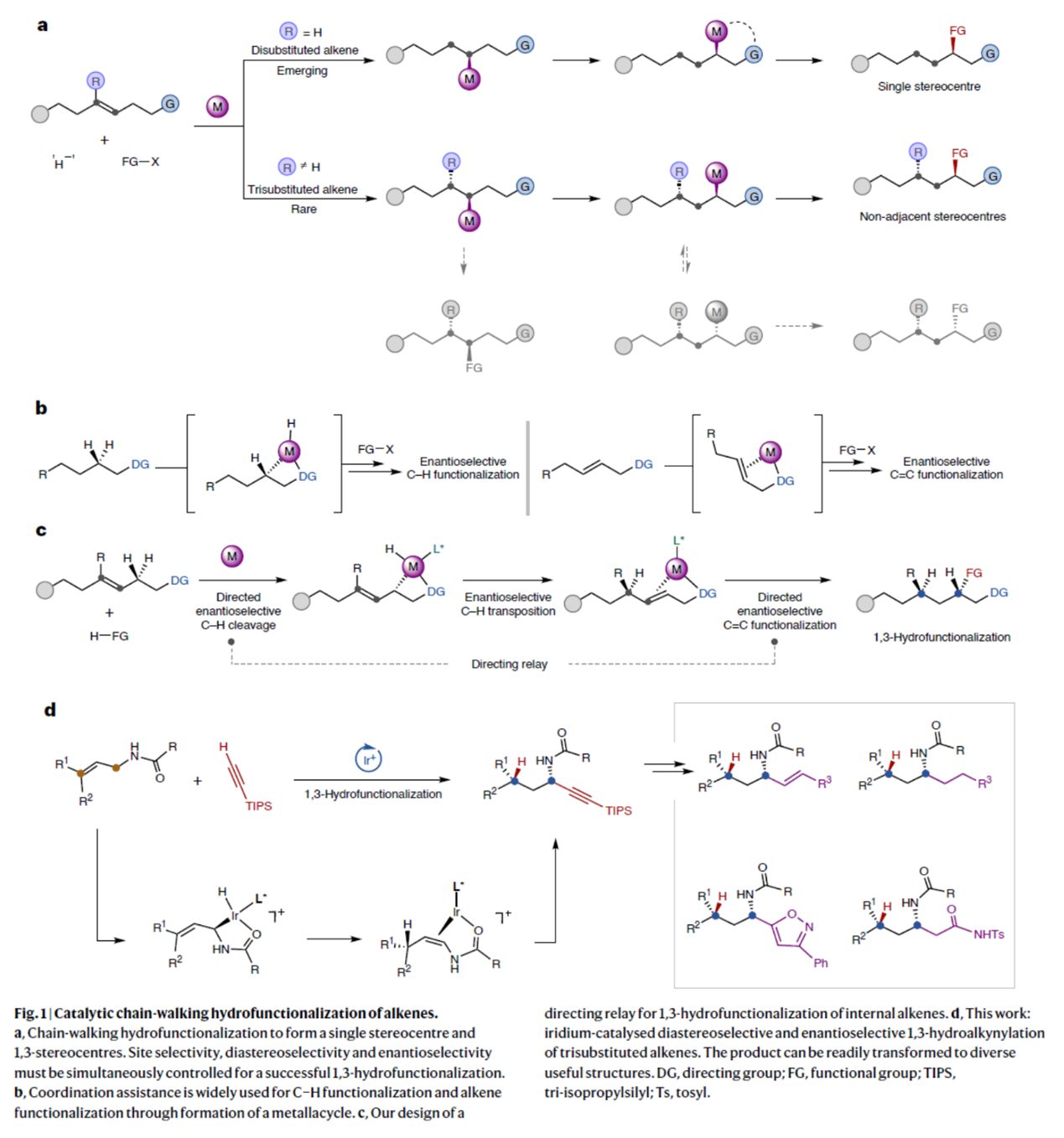 在药物化学领域,碳饱和程度及手性中心在药物研发中的重要性日益受到关注,因为分子中C(sp3)的富集度与候选药物的成功概率呈显著正相关。因此,通过将平面分子直接转化为含多重立体中心的三维化合物来快速获取结构复杂性,将加速化学空间的探索进程,从而推动先导化合物的发现。在此背景下,从sp2-杂化烯烃立体选择性地构建sp3-杂化碳中心,是有机合成中最重要的方法之一。特别是,烯烃的氢官能团化极具吸引力,其不仅具备100%的原子经济性,还能在构建多样化C-X键时,同时建立手性中心。这类氢官能团化方法通常将氢原子和官能团加成到碳碳双键上,生成1,2-加成产物。若能实现非常规的1,n-区域选择性,将大幅拓展烯烃氢官能团化所能触及的化学空间,并为药物研发进程提供重要助力。近年来,链行走过程已成为在反应性碳碳双键远端构建新化学键的有力工具。通过连续的β-氢消除-再插入循环,最初形成的C–M键可迁移至远端位点,从而使官能团能够选择性和立体选择性地引入至远程位点[1](Fig. 1a)。然而,由于β-氢消除-再插入过程通常是快速且可逆的,最终位点的C–M键官能团化往往决定了反应的位点选择性与立体选择性。因此,现有链行走氢官能团化方法通常仅能生成单一立体中心,而对于非相邻立体中心的高度非对映与对映选择性构建,尚未实现。为了进一步扩展链行走官能团化过程的潜力,李必杰课题组试图利用π-烯丙基金属氢化物中间体作为穿梭剂,在烯烃异构化过程中传递负氢。由此生成的异构化烯烃随后可进行官能团化反应,并将官能团引入远端位点。为了控制这两个步骤的对映选择性,李必杰课题组计划利用配位辅助策略,该策略在导向C-H键官能团化[2]和烯烃官能团化[3]中得到了广泛的应用(Fig. 1b)。首先,烯烃上的极性官能团会优先与金属中心配位,从而导向对映选择性亚甲基C–H键的断裂。在立体选择性烯烃异构化后,该官能团仍保持与金属中心的配位状态,并导向后续的对映选择性C=C官能团化反应。这种导向接力策略可有效控制C–H键和C=C官能团化两步反应的位点选择性和对映选择性。值得注意的是,由于各步骤的立体选择性由独立催化剂控制,通过调节配体和烯烃构型,可实现立体发散性合成,从而获得1,3-氢官能团化产物的所有四种可能立体异构体(Fig. 1c)。基于前期对于导向烯烃氢官能团化反应[4]的持续研究,近日,清华大学的李必杰课题组利用导向接力策略,实现了非环状内烯烃的催化1,3-氢炔基化反应(Fig. 1d)。