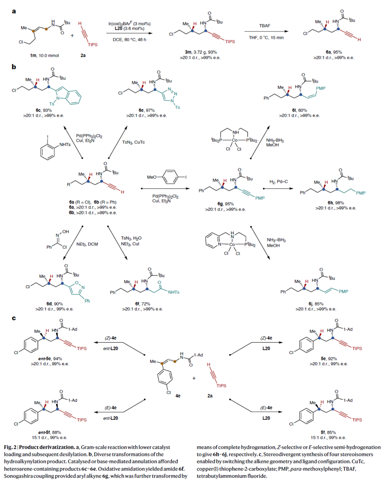 紧接着,作者对反应的实用性进行了研究(Fig. 2)。首先,1m和2a的克级规模实验,可进一步降低催化剂的负载量,同样可以93%的收率得到产物3m。同时,3m在TBAF/THF条件下可进行去硅基化,合成含有末端炔基的产物6a,收率为95%(Fig. 2a)。其次,产物6中的炔基可分别进行钯催化环化、[3+2]环化、点击反应和氧化酰胺化反应,获得相应产物6c–6f,收率为72-97%(Fig. 2b)。同时,产物6中的炔基还可进行Sonogashira偶联反应,生成芳基炔烃化合物6g,收率为95%。化合物6g可分别进行全氢化、Z-选择性和E-选择性半氢化反应,分别获得烷基和乙烯基取代的1,3-氢官能团化化合物6h–6j,收率为60-98%。值得注意的是,在后续衍生化中,反应均保持高度的非对映和对映选择性。此外,通过切换烯烃几何形状和配体构型,可以高度的立体选择性获得1,3-氢官能团化产物中的四种立体异构体,如5e、5f、ent-5e和ent-5f(Fig. 2c)。
