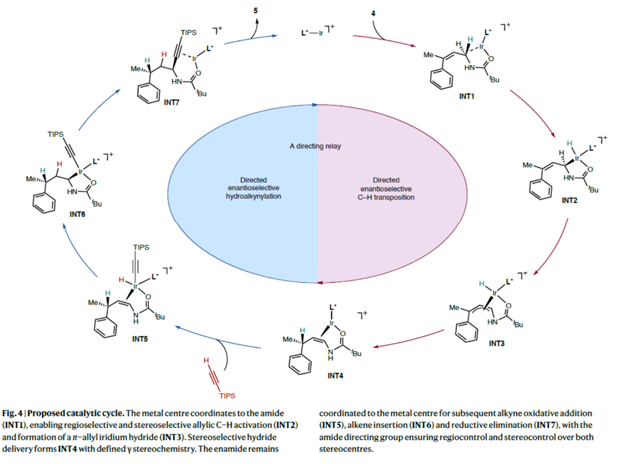 最后,作者提出如下合理的反应机理(Fig. 4)。首先,金属中心与酰胺基配位(中间体INT1)。该配位作用导向低价金属中心区域选择性和立体选择性地断裂烯丙位C-H键(中间体INT2)。随后形成π-烯丙基铱氢化物(中间体INT3),通过该物种,负氢被立体选择性地转移至γ位(中间体INT4)。此过程生成含有首个立体中心的烯烃异构化产物(烯酰胺)。由于从INT1到INT4的转化是立体专一性过程,烯烃构型(E/Z)的改变将导致γ位绝对构型发生翻转。生成的烯酰胺不会从金属中心解离,而是不可逆地结合到金属中心以进行后续反应步骤。末端炔烃发生氧化加成(INT5),随后发生烯烃插入(INT6)和C–C键形成的还原消除(INT7)。在烯酰胺氢炔基化过程中,酰胺基团有效地与金属中心配位,从而控制区域选择性和立体选择性。这种导向接力策略对烯烃异构化和烯酰胺氢炔基化步骤均实现了高度的区域控制和立体控制,最终实现了两个非相邻立体中心立体化学的精确调控。