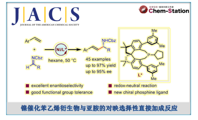 南开大学的周其林与肖力军课题组首次报道了一种苯乙烯及其衍生物与醛亚胺的催化对映选择性直接加成反应,该反应通过手性6,6′-二取代螺二氢茚单膦配体与镍(0)催化剂的协同作用实现。该方法无需使用烯基金属试剂,可直接以苯乙烯类化合物为原料高效合成多种手性烯丙胺类化合物,具有优异的对映选择性。该反应展现出广泛的官能团兼容性,可适用于多种芳基烯烃与醛亚胺底物。