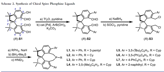 首先,作者以四甲基-1,1′-螺二氢茚-7,7′-二甲醛(R)-S1为起始底物,进行了八种手性螺单膦配体的合成(Scheme 2)。采用Tf2O对(R)-S1进行酯化,并通过连续Suzuki偶联反应在四甲基螺二氢茚骨架的6,6′-位引入不同芳基取代基,得到中间体(R)-S2。随后,采用NaBH4还原并采用SOCl2进行氯化,得到中间体(R)-S3。最后,与相应的烷基取代二氢膦发生环化反应,经硼烷保护及后续脱保护步骤,成功制备螺环单膦配体L1–L8。