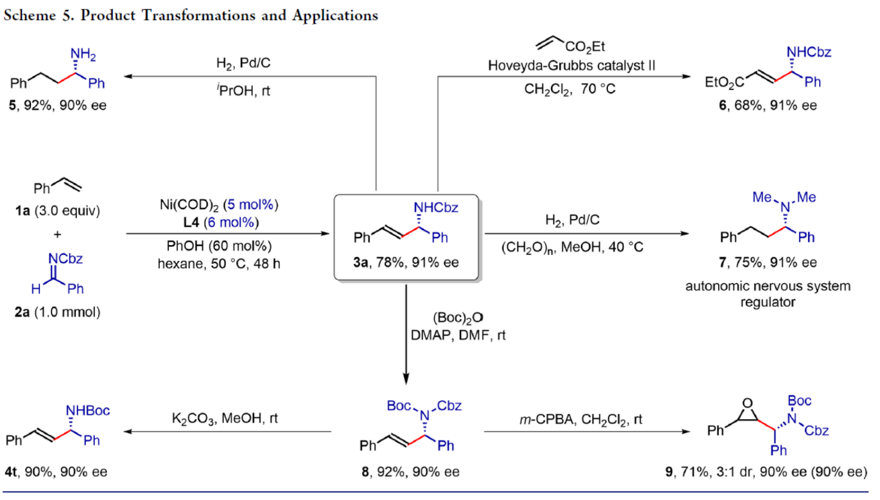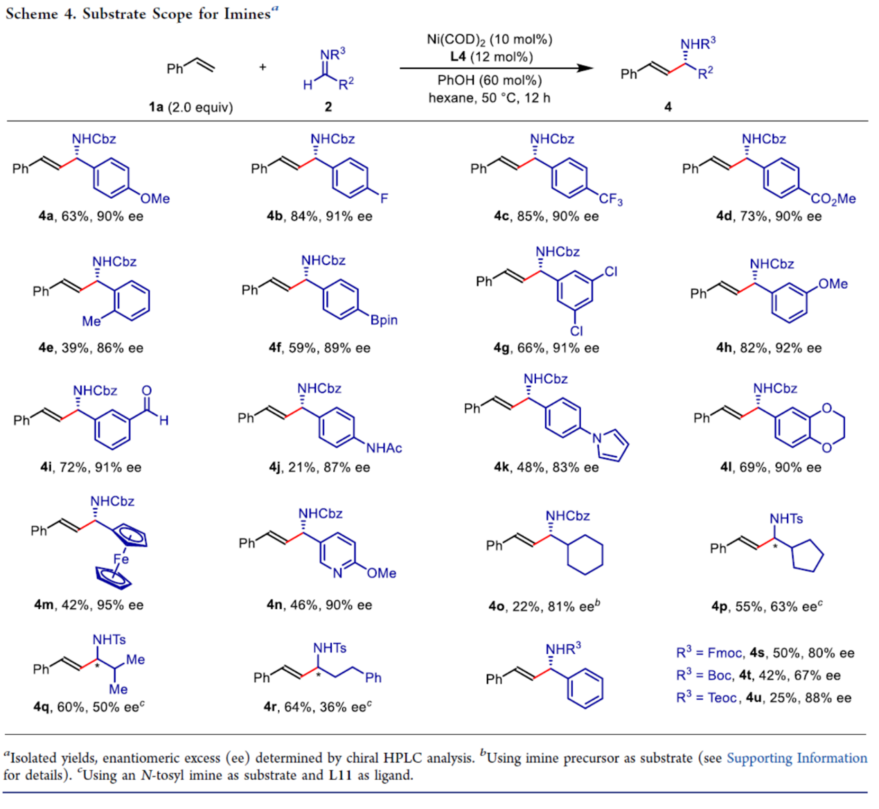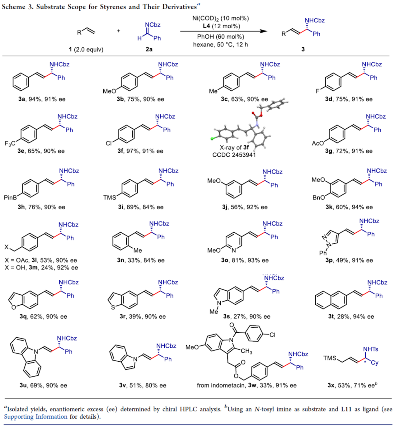 其次,作者采用苯乙烯1a与亚胺衍生物2a作为模型底物,进行相关反应条件的优化筛选 (Table 1)。进而确定最佳的反应条件为:采用Ni(COD)2作为催化剂,L4作为手性配体,PhOH作为Brønsted酸,在己烷反应溶剂中,反应温度为60 oC,最终获得94%分离收率的产物3a(91% ee)。