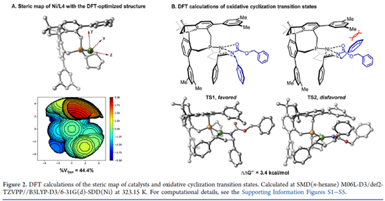 为深入理解新开发的手性螺环膦配体的作用机理及手性诱导起源,作者进行了密度泛函理论(DFT)计算(Figure 2)。对含配体L4的镍配合物进行的DFT初步优化显示,其具有由深手性口袋构成的独特空间环境(Figure 2A)。基于DFT计算提出的手性诱导模型表明,对映选择性由氧化环化步骤决定(Figure 2B)。该阶段中,由于亚胺苯基与配体1,3-二甲基苯基间的空间排斥作用,通过过渡态TS1形成了空间位阻更优的氮杂镍杂环中间体。