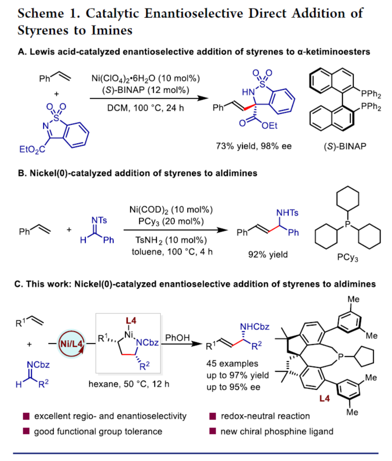手性烯丙胺骨架广泛存在于各类天然产物、农用化学品和药物分子等中,同时其也作为有机合成中的多功能砌块。因此,开发通用且高效的手性烯丙胺对映选择性合成方法已成为合成化学的重要研究方向。其中,由于合成效率与成本的优势,烯基亲核试剂与亚胺直接不对称加成构建碳-碳键的方法备受关注,并已取得了一定的进展[1]。然而,将苯乙烯类等廉价易得的烯烃不对称加成到亚胺上,仍具有挑战。2015年,Jia团队报道了一种Lewis酸催化苯乙烯与高活性环状ketiminoesters的不对称加成反应,合成了手性烯丙基胺类化合物[2](Scheme 1A)。2018年,周其林团队开发了一种镍催化苯乙烯与醛亚胺的直接加成反应,该反应关键依赖于富电子的单膦配体,例如三环己基膦[3](Scheme 1B)。这些配体能够提升镍(0)中心的电子密度,从而促进必需的氧化环化过程。尽管可合理地预测手性富电子单膦配体可实现相应的对映选择性转化,但迄今为止此类配体的可用种类依然有限。因此,通过此途径实现苯乙烯衍生物与亚胺的高度对映选择性直接加成反应,仍是一个未解决的难题。近日,南开大学的周其林与肖力军课题组报道一种全新的镍催化苯乙烯及其衍生物与醛亚胺的直接不对称加成反应,合成了一系列手性烯丙胺类化合物,涉及新型手性螺环膦配体(源于四甲基-1,1′-螺二氢茚骨架)使用,具有优异的对映选择性和区域选择性、高原子经济性、优异的官能团耐受性等特点(Scheme 1C)。