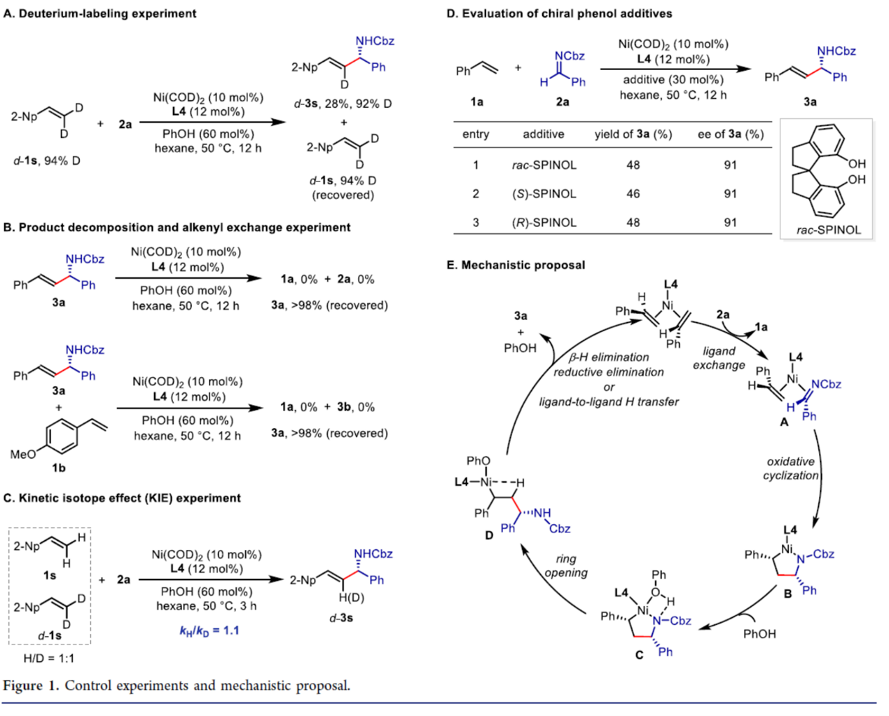 随后,作者对反应的机理进行了研究(Figure 1)。首先,氘代实验结果表明,氮杂镍环的形成与β-氢消除可能为不可逆过程(Figure 1A)。同时,在标准条件下,未观察到产物3a的分解,也未检测到其烯基交换现象,从而进一步证明了上述的结果(Figure 1B)。其次,KIE实验结果表明,β-氢消除不太可能是决速步骤(Figure 1C)。此外,通过评估各种手性酚作为添加剂的实验结果表明,与苯酚相关的氮杂镍环的开环步骤不太可能涉及手性诱导(Figure 1D)。基于上述的实验研究以及前期相关的文献报道[4],作者提出如下合理的反应机理(Figure 1E)。首先,由镍催化剂A与底物1a和2a配位形成手性镍配合物B,其经决定对映选择性与区域选择性的氧化环化反应,生成氮杂镍环中间体C。随后,中间体C在与苯酚作用下进行开环反应,继之以β-氢消除以及还原消除或通过中间体C–D进行的配体-配体间氢转移,最终再生出零价镍催化剂并得到产物3a。