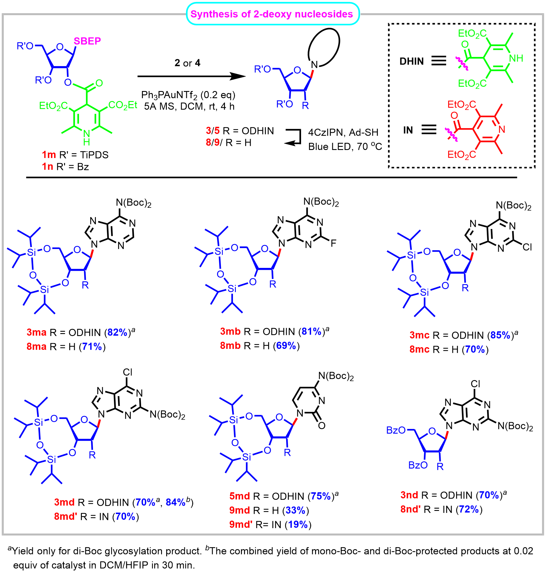 Fig. 4 | Synthesis of 2’-deoxynucleoside derivatives by the combination of BEPT protocol and photocatalyzed C-O bond editing techniques (1,4-dihydroisonicotinoyl (DHIN) was used as stereo-controlling and deoxygenation-initiating group and the direct saturation of DHIN group to isonicotinoyl (IN) group was found to the major side reaction).
