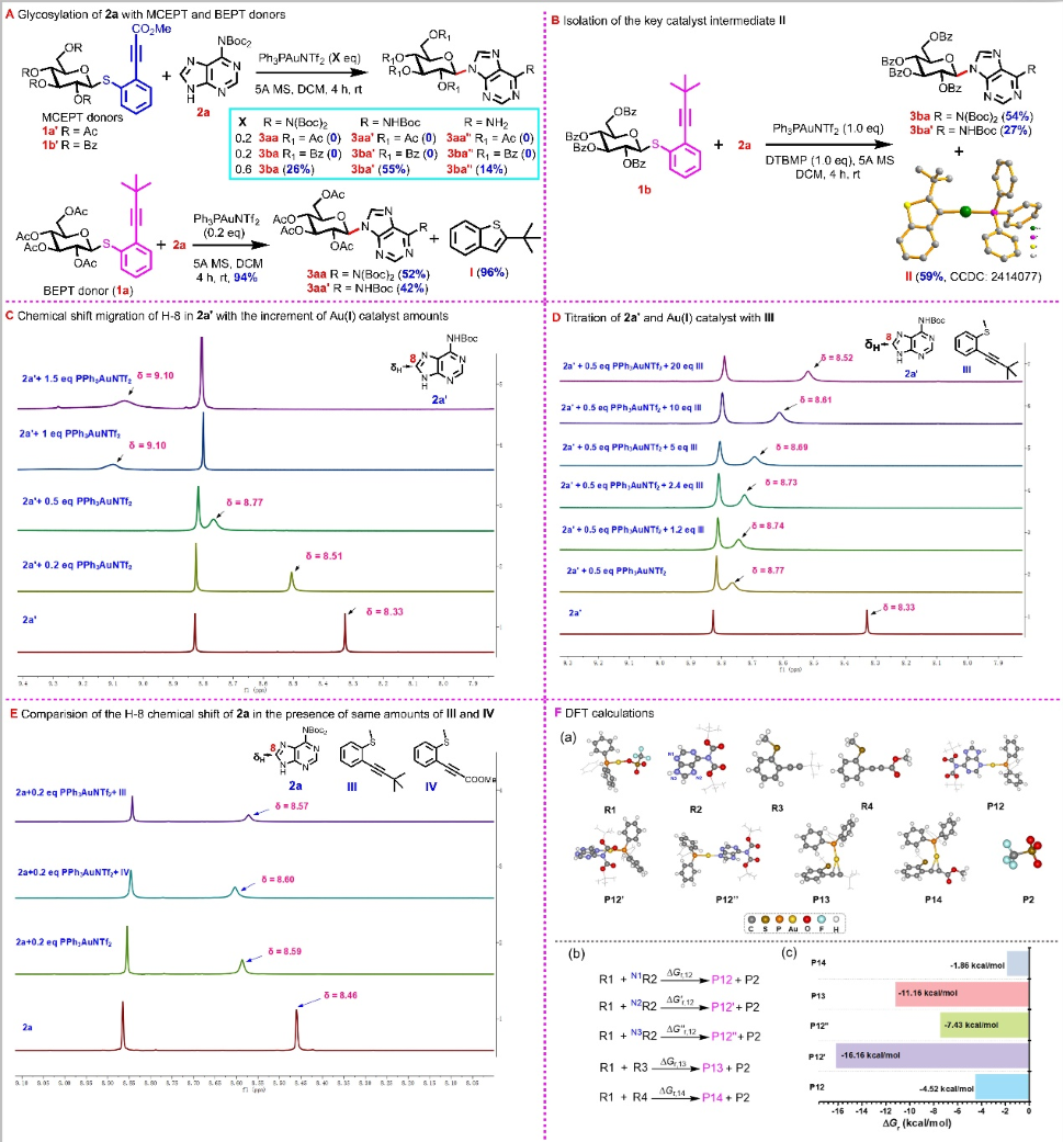 本研究源于一个初步实验,作者尝试利用课题组前期报道的MCEPT糖基给体(J. Am. Chem. Soc. 2023, 145, 3682−3695)合成核苷,但未获成功(给体未活化)。作者分析原因可能在于MCEPT给体中炔基上所连的酯基降低了炔上的电子云密度,导致在碱基存在的情况下,一价金催化剂难以与炔基有效配位,从而无法启动该糖苷化反应。然而在前期研究中作者已阐明,该酯基在MCEPT糖苷化策略中具有关键作用:其一,其吸电子效应可避免离去基团对反应的干扰,抑制碳苷副产物的生成;其二,它能够稳定反应过程中的一价金中间体,延缓脱金-质子化进程,促使体系中酸性积累,进而抑制原酸酯副产物的形成。这就意味着若要实现含碱基体系的糖苷化反应,需在保留酯基功能的同时,引入具有给电子效应的基团以替代MCEPT糖基给体中的酯基。经综合考量,作者认为空间位阻较大的叔丁基是理想选择,据此设计并合成了BEPT糖基给体1a,开始反应的尝试。作者发现,在一价金催化下,给体1a与受体2a反应,以94%的产率得到糖苷化产物(3aa和3aa’)并以96%的产率分离出离去基团I。该结果表明,给电子叔丁基保障了炔基上具有足够的电子云密度以启动反应;随后,作者通过金催化剂中间体捕捉实验,成功分离出关键中间体II,并利用核磁共振波谱与单晶X射线衍射确定了其结构。该中间体的存在印证了大位阻叔丁基对反应过程中的一价金物种的稳定作用。上述结果共同证实了叔丁基是实现该高效反应的成功设计。之后作者对其反应机制进行了研究,通过核磁共振谱图证实了金催化剂与碱基受体之间存在配位作用并揭示了金催化剂、碱基和给体类似物(III和IV)之间的相互作用。结合DFT计算,进一步阐明了嘌呤受体2a、BEPT给体类似物III和MCEPT类似物IV之间结合能的相对大小。基于上述实验结果,作者提出了可能的反应机理:嘌呤受体2a优先与反应体系中的一价金催化剂配位,并在体系中形成配位-解离平衡,也就意味着在反应体系中存在着低浓度的游离态一价金催化剂。对于BEPT糖基给体,其炔基上具有较高的电子云密度,即使在低浓度的金催化剂的条件下仍可被有效活化。相比之下,MCEPT给体由于炔基电子云密度较低,与金的配位能力弱,难以在相同条件下被活化。为验证该机理,作者在MCEPT给体的反应体系中加入0.6当量的催化剂,反应能以95%的糖苷化产率获得所需的产物,进一步支持了上述假设(Fig. 1)。