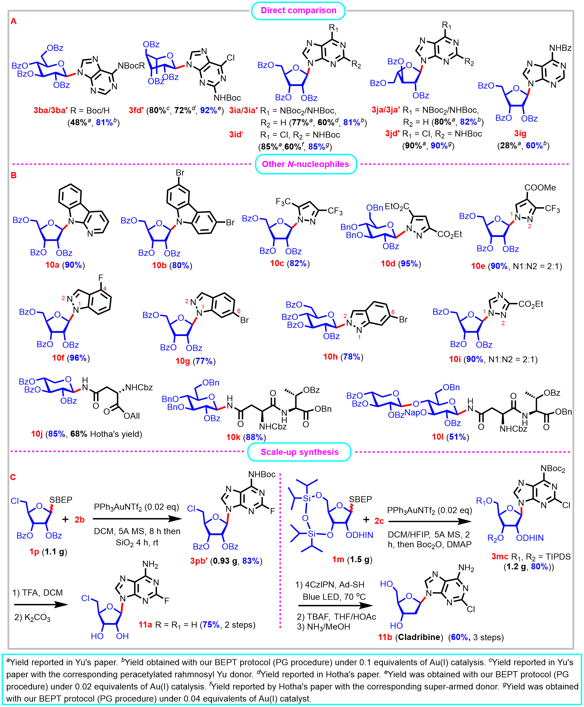 Fig. 5 | Examination of the practicality of the BEPT protocol. A) Comparison of the BEPT protocol with ABz and EGC protocols (ABz: o-alkynylbenzoyl, EGC: ethynylcyclohexyl glycosyl carbonate). B) Glycosylation of other N-nucleophiles (the chemical structures were unequivocally determined by 1D and 2D NMR). C) Scalable synthesis of nucleoside drugs (the N-glycosylation steps were conducted on gram-scale).