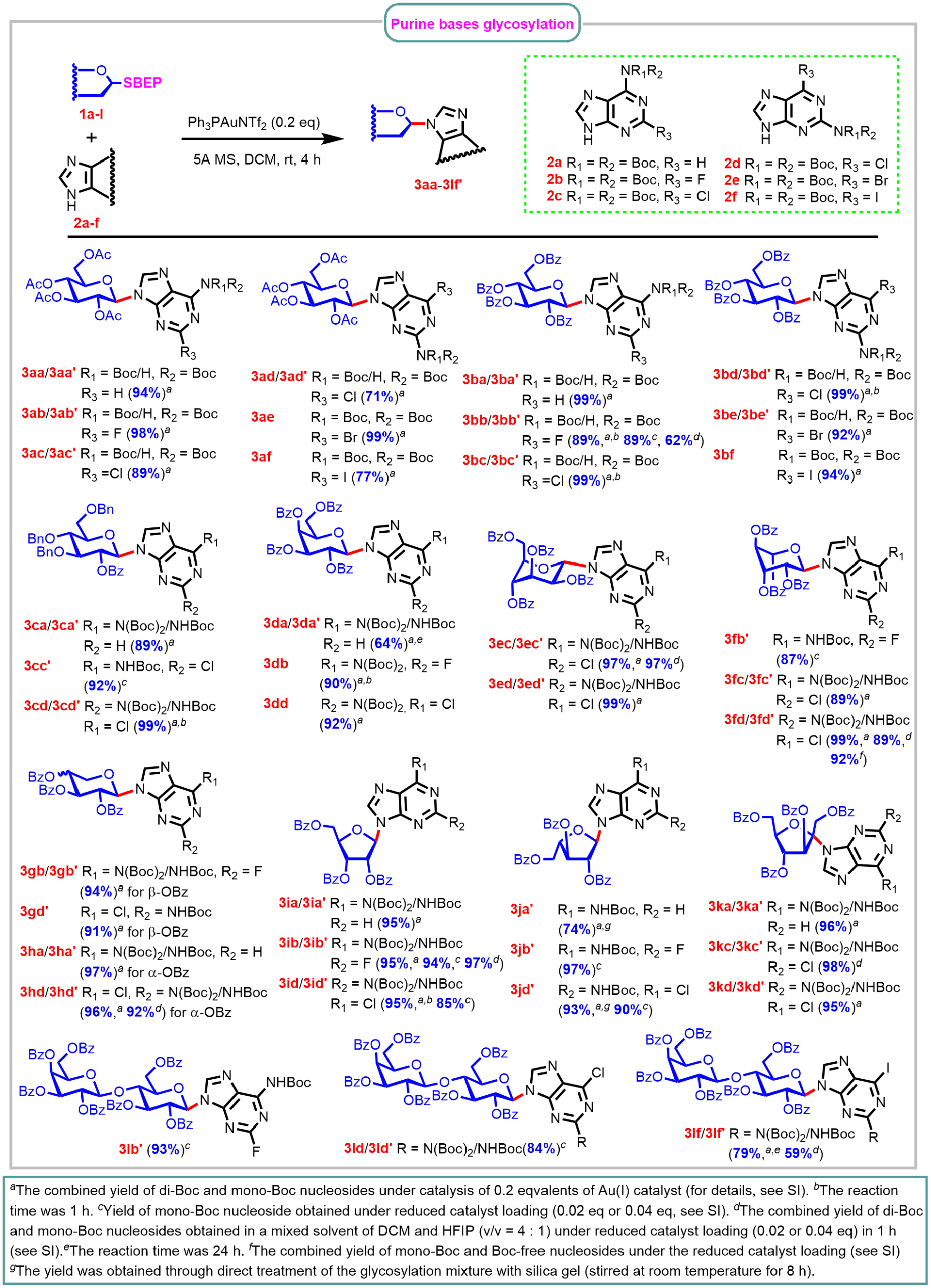 Fig. 2| Direct synthesis of purine-type N-glycosides through the PG procedure of the BEPT protocol. (Boc-protected purine derivatives were selected as acceptors. Boc: butoxylcarbonyl)
