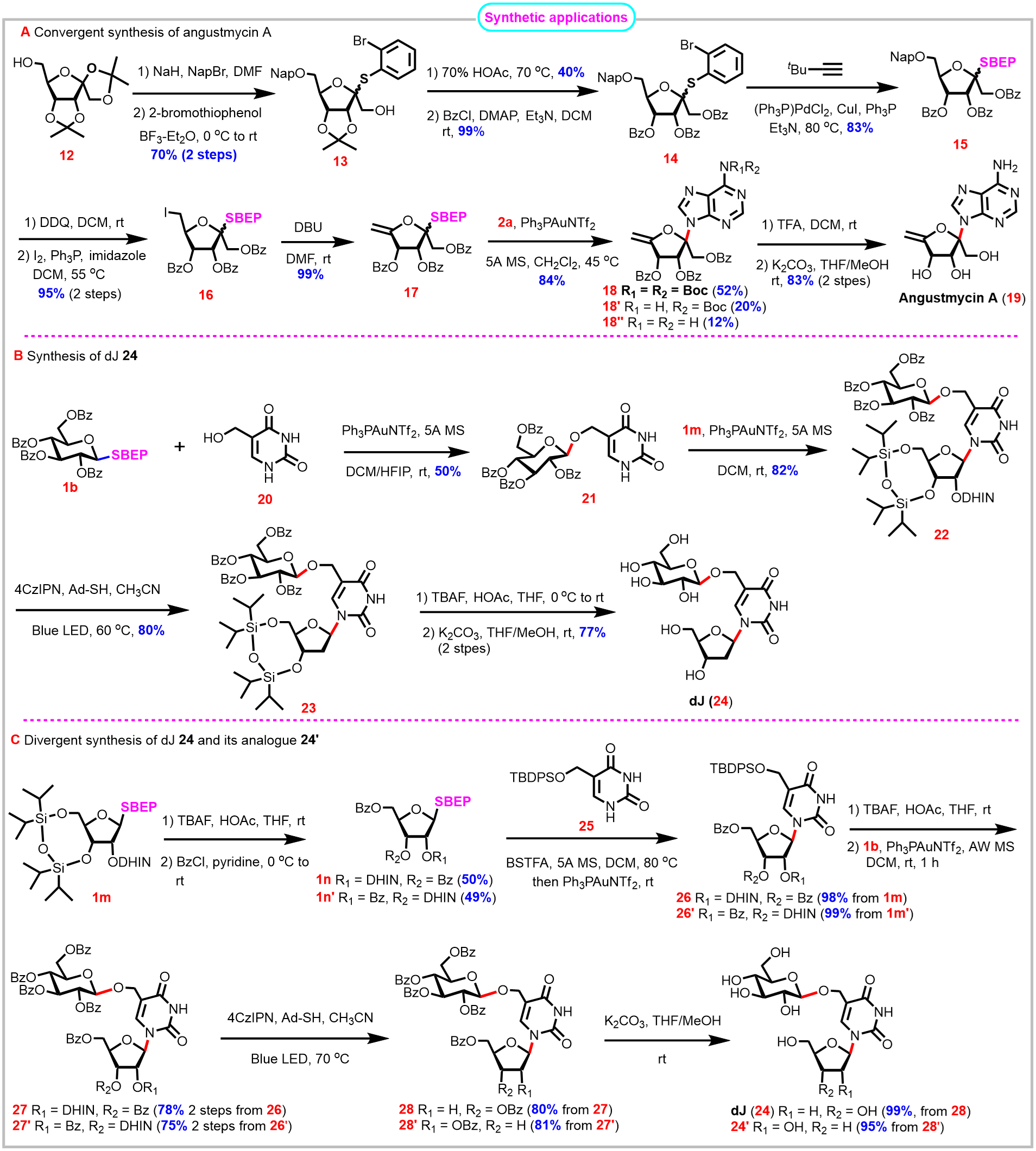 Fig. 6 | Synthesis of augustmycin A (19), dJ (24), and dJ analogue (24’). A) Convergent synthesis of angustmycin A (N-glycosidic linkage construction after exo-glycal fabrication). B) Synthesis of dJ 24 (the glycosidic linkage construction sequence is O-glycosidic linkage first and then N-glycosidic linkage). C) Divergent synthesis of dJ 24 and its analogue 24’ (the glycosidic linkage construction sequence is N-glycosidic linkage first followed by O-glycosidic linkage).