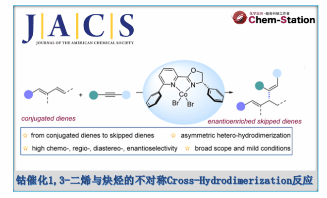 南方科技大学的舒伟课题组首次报道一种全新的钴催化1,3-二烯与炔烃不对称Cross-Hydrodimerization反应,高效合成了一系列对映体富集的1,4-二烯衍生物。机理研究表明,该反应经历了一个连续氢金属化和碳金属化的串联过程,具有优异的化学选择性、区域选择性以及对映选择性的控制。此外,该反应展现出对多种底物的良好耐受性,包括芳基和脂肪族炔烃、端炔和内部炔烃,以及具有不同取代模式的1,3-二烯。