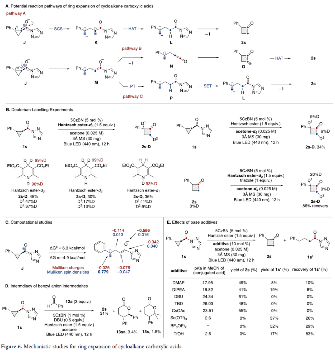 基于上述的研究,作者推测,环烷羧酸底物(1s–1z)的扩环反应机制不同于α-杂环羧酸的路径。因此,作者提出了三种可能的反应机理(Figure 6A)。在pathway A中,底物1s的酮基自由基阴离子J经SCS过程开环,生成含苄基阴离子与α-羰基自由基的中间体K,二者分别发生分子内酰基取代反应与氢原子转移(HAT)。在pathways B与C中,中间体J的C-C键均裂生成含苄基自由基和烯醇化物部分的M。在pathway B中,伴随三唑阴离子I的消除形成烯酮N,随后经历自由基4-exo–dig环化生成α-羰基自由基O,最终经HAT过程转化为产物2s。在pathway C中,M的烯醇化物部分质子化形成苄基自由基P,再通过还原性自由基-极性交叉转化为苄基阴离子L。为了区分这些反应途径,作者进行了相关的实验研究。首先,氘代实验结果表明,pathway C在动力学和热力学上是最可行的(Figure 6B)。开环中间体的自然布居分析(NPA)表明:自旋密度定域于苯甲基位点,负电荷则定位于烯醇位点(Figure 6C)。其次,中间体捕获实验结果表明,反应涉及苄基阴离子物种作为反应的中间体(Figure 6D)。此外,碱添加对于反应的影响研究表明,降低碱添加剂的共轭酸酸性,可抑制苄基阴离子发生竞争性质子化副反应,从而促进苄基阴离子对酰基唑基团的分子内亲核加成(Figure 6E)。
