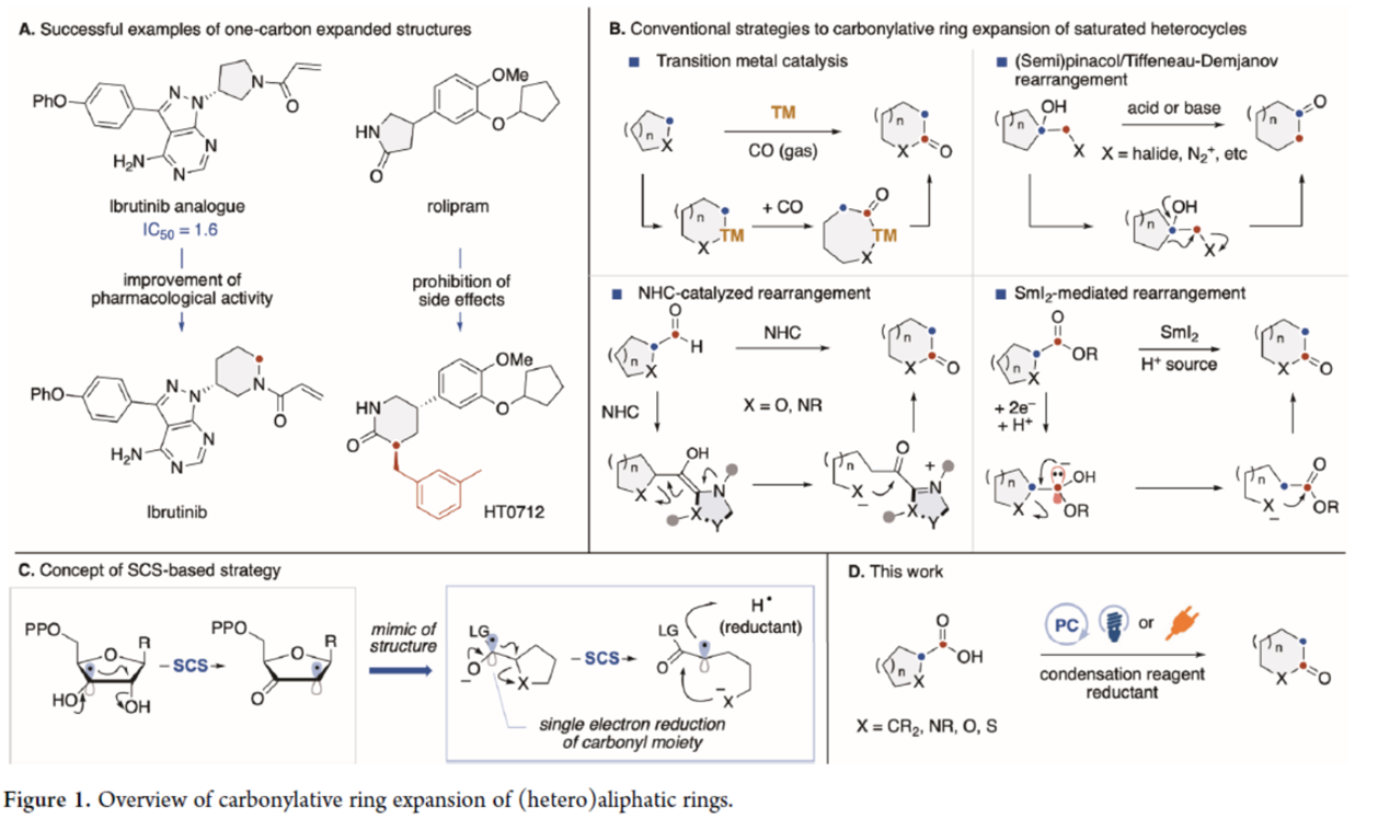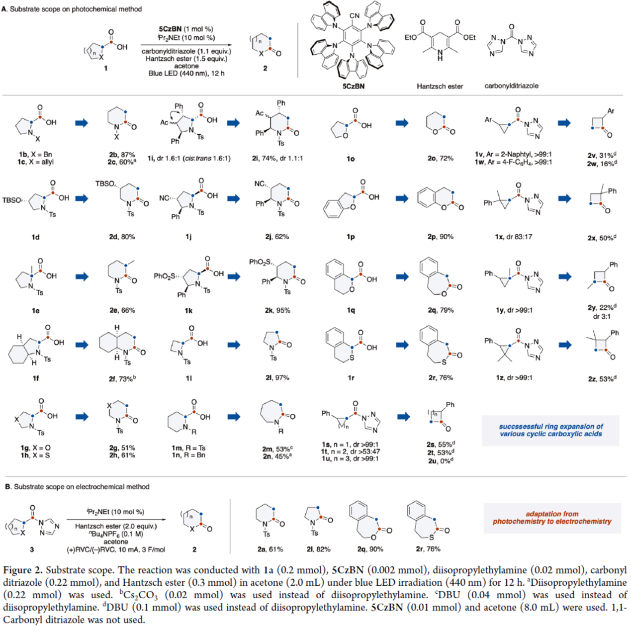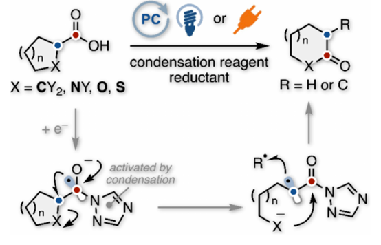 在现代药物研发领域,饱和杂环化合物因其更优的溶解性、结合亲和力及特异性,常比芳香环更受青睐。因此,对饱和杂环的结构修饰(如环收缩与扩环)作为药物化学中的重要工具之一,已获得广泛关注。在众多方法中,单碳扩环反应尤为突出。例如,通过单碳扩环的修饰显著提升了药理活性并降低了副作用(Figure. 1A)。然而,单碳扩环结构的合成路径,目前主要依赖于从头合成,而非对母体分子进行直接的单碳扩环。羰基化扩环反应是将羰基单元插入饱和杂环化合物中的代表性扩环反应之一。通常,(杂)脂肪环的羰基化扩环通过开环、羰基源引入及随后的闭环重构步骤进行,这些步骤可以是分步或协同发生的(Figure. 1B)。在过去几十年中,诸多研究团队已为利用一氧化碳进行羰基化扩环反应设计和开发了多种过渡金属催化剂[1]。或者,(Semi)pinacol重排反应[2]和Tiffeneau−Demjanov重排[3]反应也可归为羰基化扩环反应。其次,通过化学选择性生成碳负离子,可促进环外羰基并入环状骨架。例如,Gravel团队利用NHC有机催化剂,分别实现了环状α-氨基醛和α-氧基醛扩环生成内酰胺和内酯的反应[4]。此外,SmI2-介导的α-羰基(杂)脂肪环还原开环反应,也被用于扩环转化[5]。然而,现有方法在开环步骤中主要依赖过渡金属催化剂的氧化加成或碳正离子-碳负离子重排反应,并且其常受限于高温、强酸性或强还原性等条件。受到近年来对于通过自旋中心转移策略断裂强C−X键(Figure 1C)相关研究报道[6]的启发,这里,日本京都大学的Kazunori Nagao与Hirohisa Ohmiya课题组报道一种全新的环状羧酸的光化学或电化学羰基化扩环反应,进而合成了一系列内酰胺、内酯和硫代内酯衍生物(Figure 1D)。