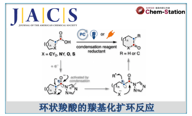 日本京都大学的Kazunori Nagao与Hirohisa Ohmiya课题组开发了环状羧酸在光化学与电化学还原条件下的羰基化扩环新策略。该方案成功从易得的环状羧酸出发,构建出具有高sp3-特性的环状骨架。此方法与α-氨基C-H键羰基化融合后,已发展为环状烷基胺类药物的强效分子编辑技术,可显著加速构效关系(SAR)研究。