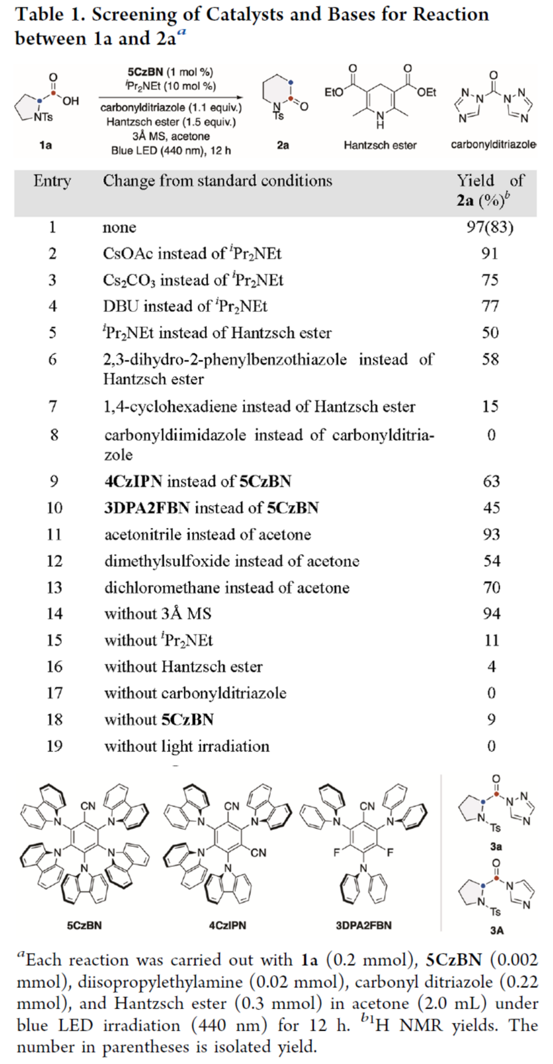 首先,作者采用N-对甲苯磺酰基脯氨酸1a作为模型底物,进行相关反应条件的优化筛选(Table 1)。进而确定最佳的反应条件为:采用5CzBN作为光催化剂,二异丙基乙胺作为碱,carbonylditriazole作为缩合试剂,Hantzsch酯作为还原剂,蓝色LED(440 nm)作为光源,在丙酮反应溶剂中,反应温度为55 oC,最终获得97%收率的产物2a。