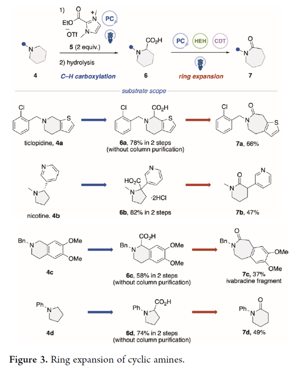 紧接着,作者对环胺的扩环反应进行了研究(Figure 3)。研究结果表明,以环胺衍生物为底物,经C-H羰基化与扩环两步反应,获得相应的内酰胺衍生物7a–7d,具有良好至优异的收率。