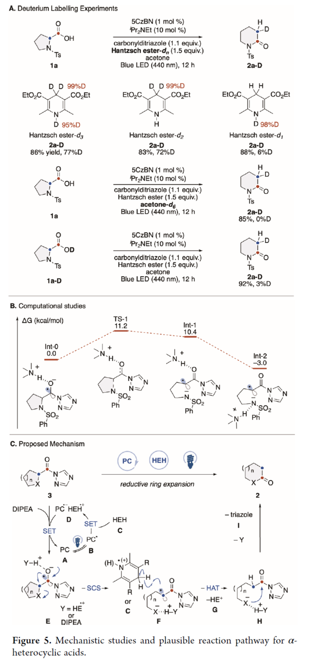 此外,作者还对反应的机理进行了研究,并提出如下合理的反应机理(Figure 5)。首先,氘代实验结果表明,α-羰基氢原子来源于Hantzsch酯的亚甲基,后者充当了自由基物种的氢原子供体。同时,质子性溶剂引入导致氘掺入率极低,表明了反应过程涉及从Hantzsch酯向α-羰基自由基的氢原子转移(HAT)(Figure 5A)。其次,通过SCS-介导的开环步骤进行了计算研究发现,SCS过程的动力学能障并不高,并且源自DIPEA的Brønsted酸使该SCS过程成为放热反应(Figure 5B)。基于上述的研究,作者提出如下的反应机理(Figure 5C)。首先,光氧化还原催化剂(PC)的基态(A)被激发至激发态(B)。该激发态(B)氧化Hantzsch酯(C),生成了一个含有PC自由基阴离子和Hantzsch酯衍生的自由基阳离子的自由基离子对(D)。催化量碱将使Hantzsch酯自由基阳离子去质子化,从而抑制(D)上的反向电子转移。随后,(D)向酰基三唑(3)提供一个电子,产生一个羰自由基阴离子(E),其将在后续的SCS过程中发生开环反应。考虑到该电子转移在热力学上不利,作者提出了一种质子耦合电子转移(PCET)的过程。然而,加入Brønsted酸并未促进电子转移进程,这表明PCET机制在本体系中并未发挥作用。目前,作者提出一个关键观点:一个容易发生的SCS过程,能够驱动原本在热力学上不利的SET。或者,该反应中可能涉及连续光诱导电子转移(ConPET)过程。经过SCS过程后,生成的α-羰基自由基(F)从Hantzsch酯自由基正离子的亚甲基、去质子化物种及(C)中攫取氢原子,从而生成含亲核基团(H)的酰基三唑产物(H)与氧化态Hantzsch酯(G)。最后,(H)中发生分子内酰基取代并脱除三唑基团,生成扩环产物(2)。在电化学反应条件下,(3)的单电子还原发生于阴极,HEH的单电子氧化发生于阳极,二者均无需光氧化还原催化剂参与。