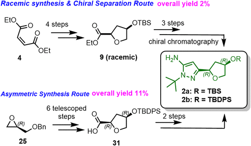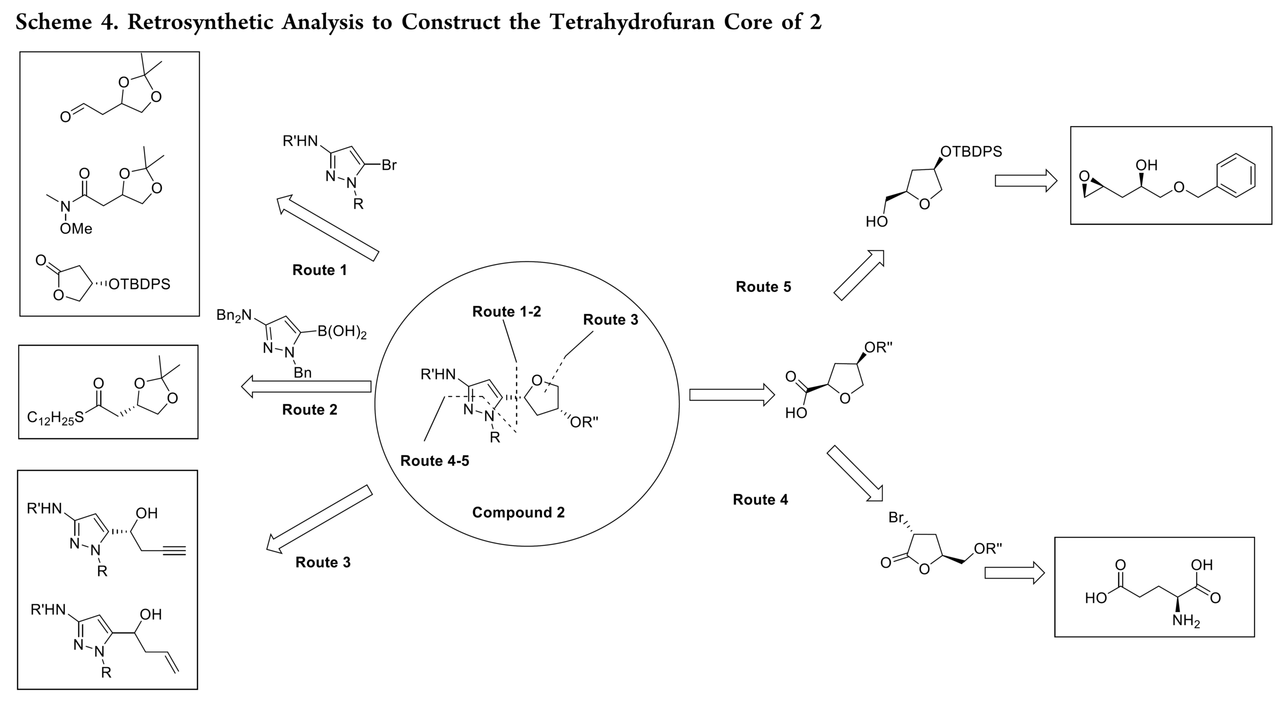 由于酶促动力学拆分路径存在严重的问题,作者对2进行了逆合成分析,并确定了五条路线,如Scheme 4所示。即初步分析筛选出五条不同路线,各具独特战略思路:路线 1 和 2 聚焦于通过 C−C 键偶联吡唑单元与预功能化的四氢呋喃片段;路线 3 探索以后期 四氢呋喃环闭合作为关键成键步骤;路线 4 和 5 则采用手性池策略,分别利用两类市售手性原料构建 四氢呋喃环,再通过初始外消旋合成中验证有效的稳健化学方法,汇聚式引入吡唑基团。