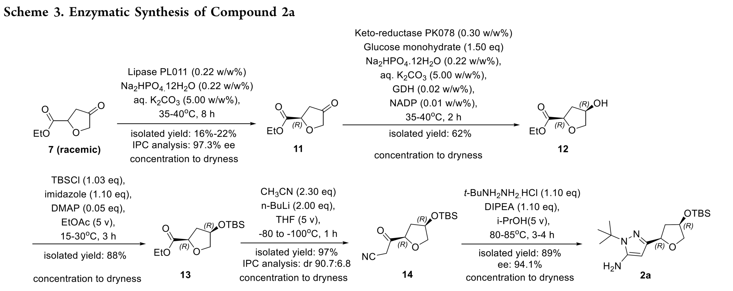 其次,作者希望利用生物催化来提高上述合成路线的效率(Scheme 3)。即以Rac–7作为原料,经脂肪酶进行动力学拆分和酶促还原构建第二个手性中心来提高选择性简化合成流程。基于此,筛选发现,脂肪酶可实现Rac–7的拆分获得所需对映体 11(97.3% ee),但实验室规模分离收率仅为 16–22%。11经酶促还原建立第二立体中心,TBS 保护得手性中间体 13;再经氰甲基化及与叔丁基肼环合,以 89% 收率得到化合物 2a。然而,深入分析发现初始脂肪酶步骤存在关键缺陷:S-酯完全水解,但目标 R-酯也发生部分水解,导致总收率降低。另外一种策略是:先用酮还原酶(KRED)还原酮基,再进行脂肪酶介导的酯水解。部分 KRED 可实现完全转化且专一生成顺式产物,但后续脂肪酶无法选择性水解非目标 (S,S)-对映体,导致分离困难、纯化效率低,收率仍不理想。