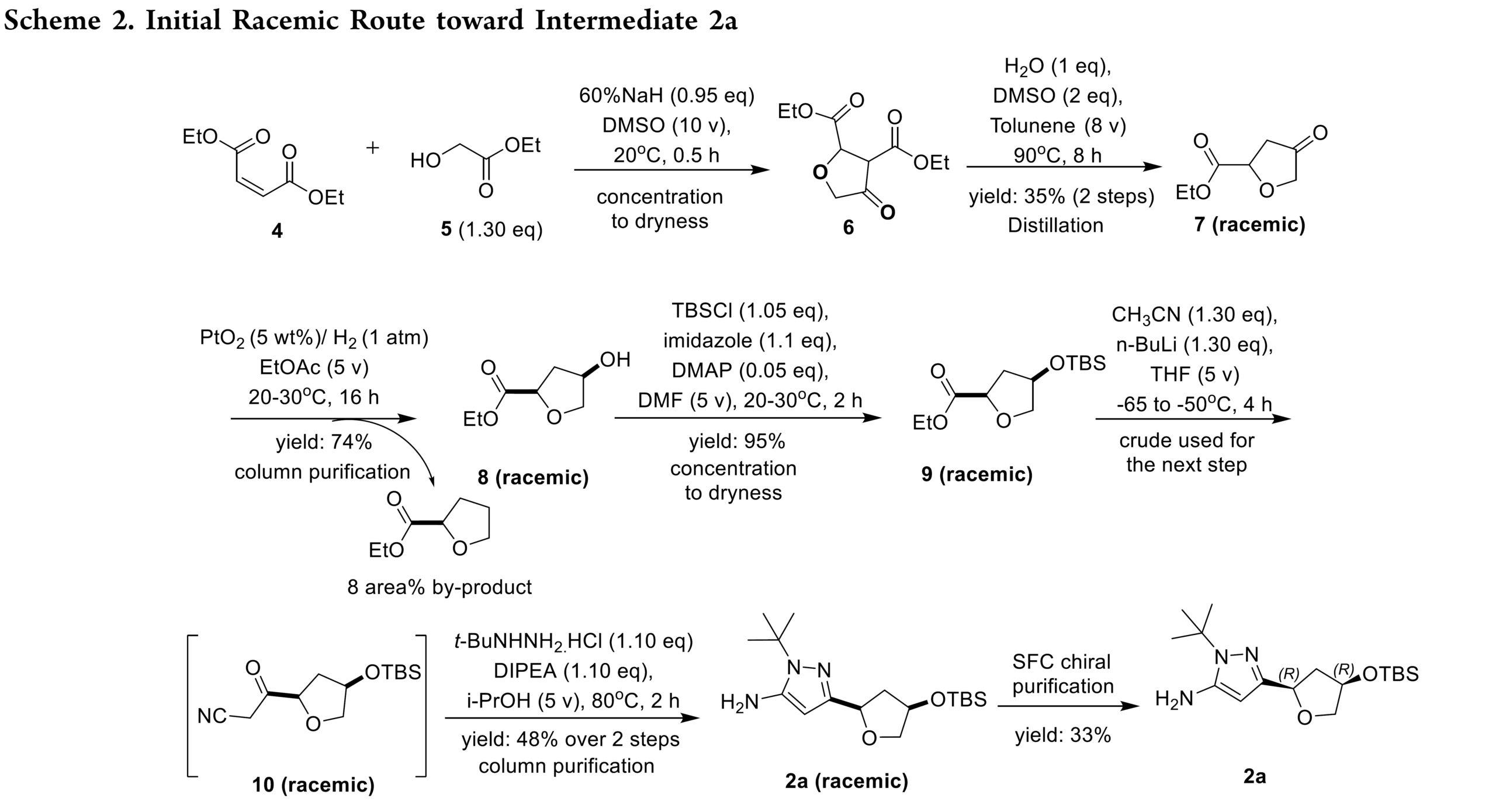 首先, 化合物 2a 的早期合成路线(Scheme 2)以马来酸二乙酯 4 和 5 为起始原料,经 Michael 加成和 Dieckmann 缩合得到纯度 >97%(GC)的 Rac–7。Rac-7 经催化氢化高选择性生成目标产物 cis–8,但伴随约 8%(面积)的过度还原杂质,需色谱纯化去除。该步骤及后续 TBS 保护后浓缩析出 Rac–9 均造成物料损失。Rac–9 经 n-BuLi 介导的氰甲基化与叔丁基肼环合,再次依赖色谱纯化获得 Rac–2a。最终通过手性色谱分离以 33% 收率得到目标对映体 2a。多个低收率步骤与重复纯化导致总收率仅为 2%。尽管该路线满足了初期 7 kg 早期开发供应,但因效率低、物料通量差且严重依赖色谱,难以放大。上述局限推动了更可放大、可持续且适用于 cGMP 生产的替代工艺的系统性开发。