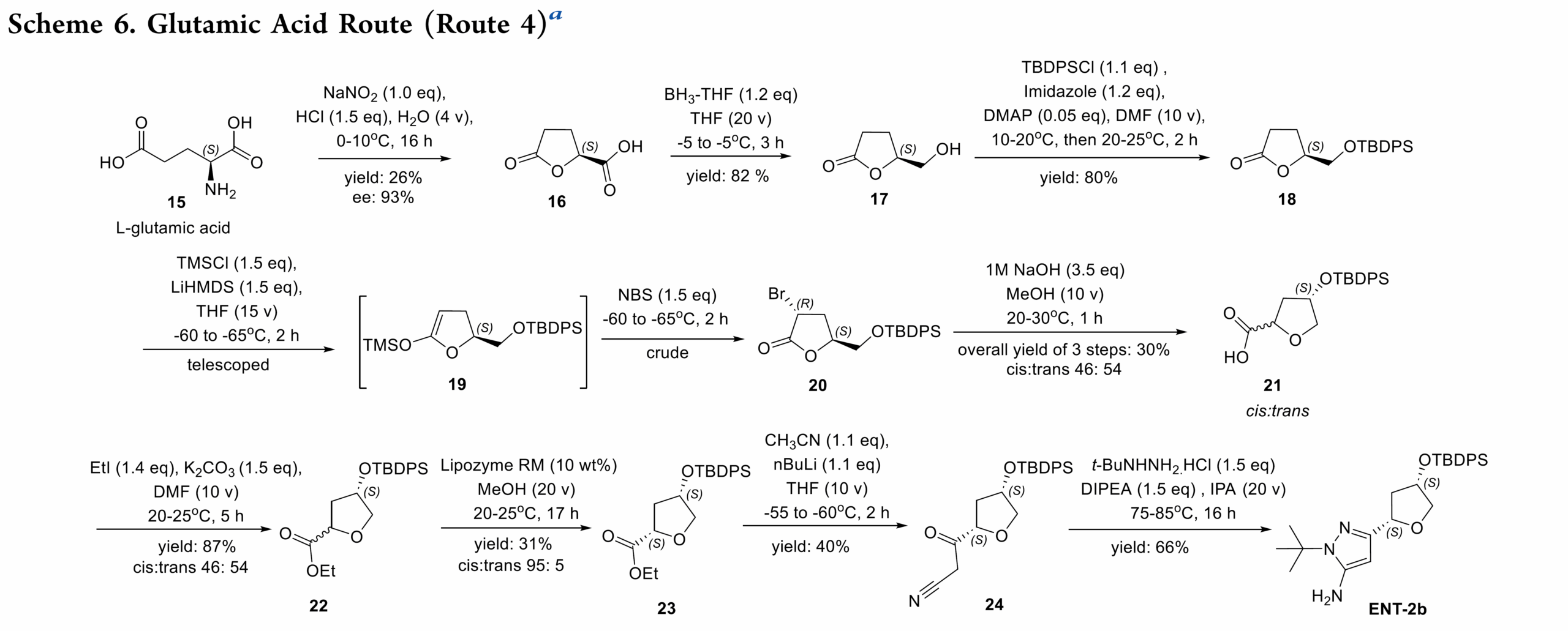 路线4:路线 4首次成功构建了目标四氢呋喃核心,验证了不对称合成的可行性。然而,该路线因手性消旋、产率低的步骤以及复杂的中间体处理在内的诸多难题,而不适用于放大生产。即以L-谷氨酸 15作为原料,经重氮化反应内酯 16(93% ee, 26% yield)且存在明显手性流失。特别,16 因高水溶性和缺乏紫外吸收基团,难以分离与表征,不利于工业化。16经还原和 TBDPS 保护得中间体 18;再经 LiHMDS 脱质子化、TMS 烯醇醚化及溴化,得到约 9:1 的非对映体混合物 20。随后发生碱催化的开环与 TBDPS 迁移,再环合生成顺反比为 46%:54% 的 22 混合物。22采用 Liposyme RM 酶促拆分,选择性水解tarns-异构体,得到顺式占优的 23(cis:trans = 95%:5%)。碱性后处理去除水解产物后,分离出 23。最后经氰甲基化及叔丁基肼环合,得到最终产物 ENT-2b(S,S-对映体)。