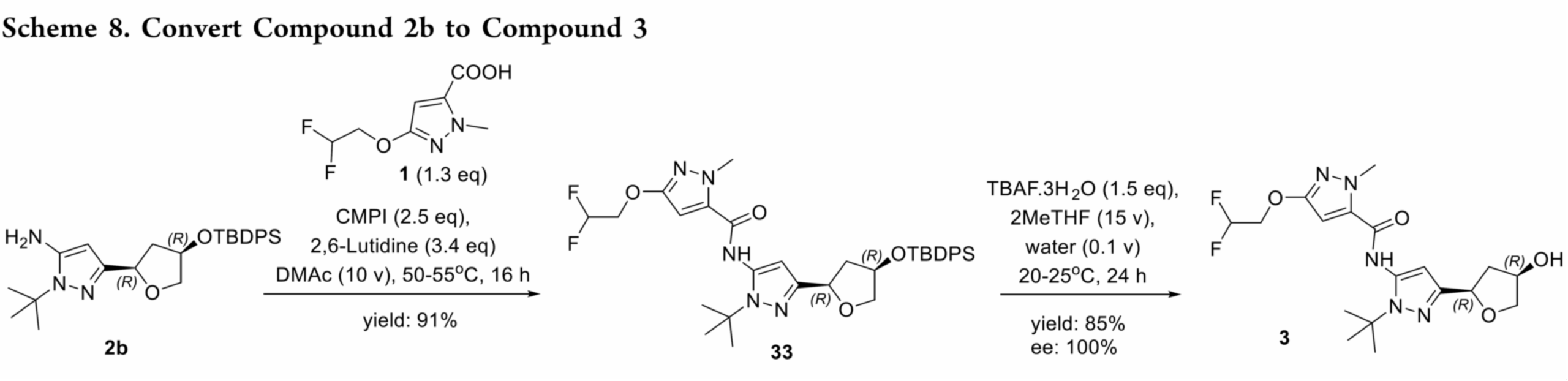 路线5:克服先前路线的局限性(Scheme 7),通过在整个合成过程中保持手性完整性,最终得到 2b。即以苄基(R)-(-)-缩水甘油醚25作为原料,经过乙烯基氯化镁的格式加成、m-CPBA 介导的末端烯烃环氧化反应、Jacobsen 水解动力学拆分(HKR)、甲硅烷基化和重排、氧化和氰甲基化、构建吡唑形成反应得到 2b。2b经酰胺偶联得到中间体 33,再经叔丁基二苯基硅烷保护基脱保护,得到 3(Scheme 8)。工艺优化表明,m-CPBA 和 Jacobsen 催化剂的质量对反应性能有关键影响。目前,该优化路线成功放大了两批,共得到 28 kg的 3。总体而言,与原路线相比,该工艺流程得到简化,生产成本降低约 50%。