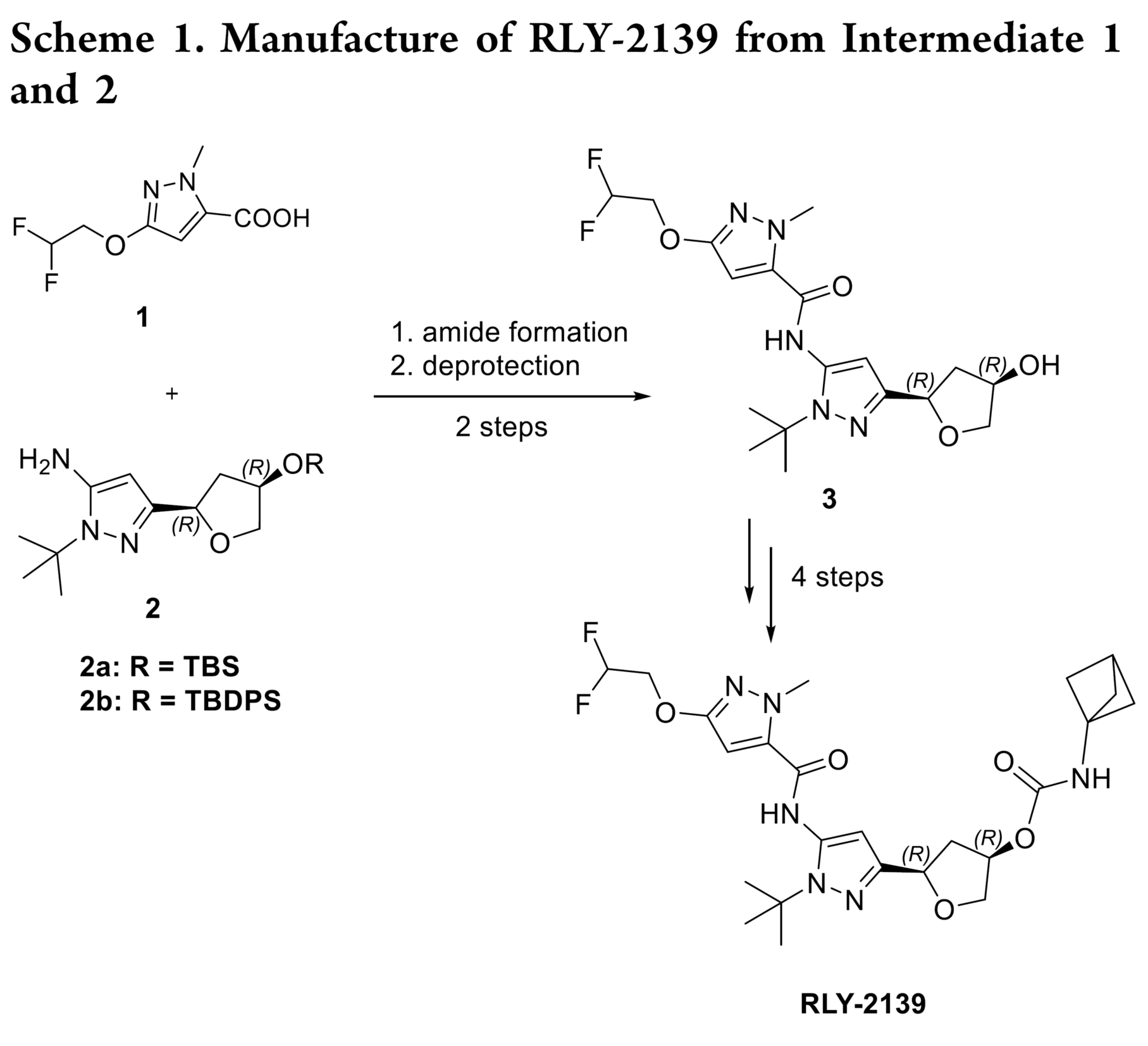 RLY-2139 是 Relay Therapeutics 开发的一种用于治疗ER+/HER2− 乳腺癌的高效选择性 CDK2 正构抑制剂。其通过选择性抑制 CDK2/细胞周期蛋白 E 复合物发挥作用,且该复合物是 CDK4/6 抑制剂耐药肿瘤中驱动细胞周期的关键因子。RLY-2139的合成采用了一种汇聚式路线,即通过两个高级中间体酰胺缩合,并进行后期官能团化(Scheme 1)。其中,化合物 2 的构建是RLY-2139合成中的最大难题。