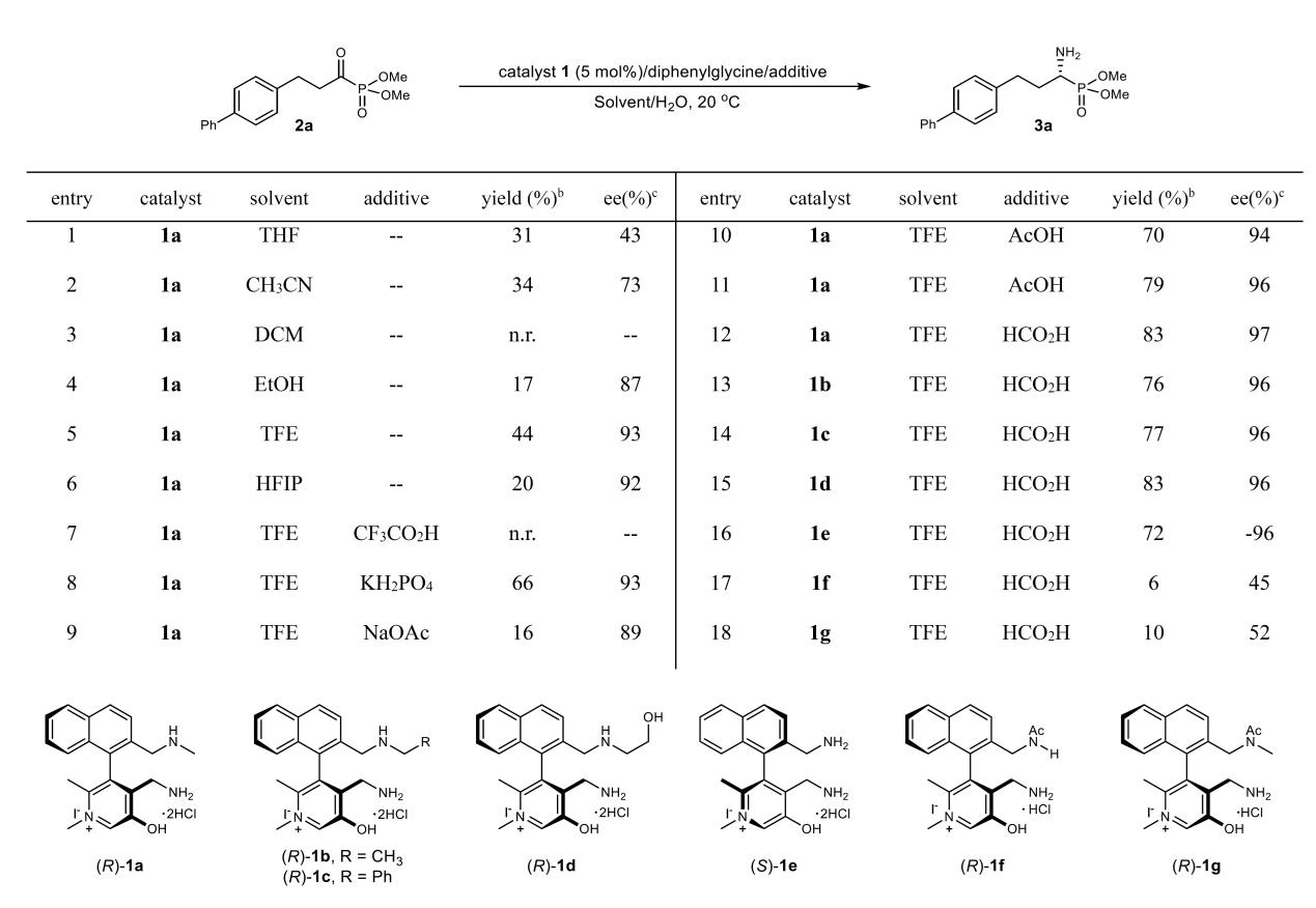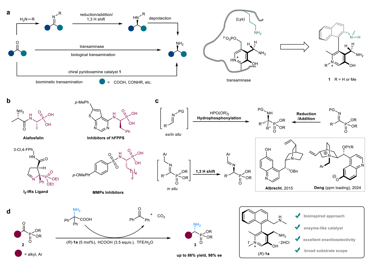 手性α-氨基膦酸酯是一类重要的有机磷化合物,广泛应用于药物化学与合成化学。且其独特结构赋予多种生物活性:如抗菌药磷霉素衍生物Alafosfalin、hFPPs抑制剂、阿尔茨海默病治疗中咪唑啉I2受体(I2-IRs)配体,以及基质金属蛋白酶(MMPs)抑制剂(Figure 1b)。鉴于其药理潜力、结构多样性和合成适应性,科学家开发了多种合成策略来制备手性α-氨基膦酸酯。如Kabachnik–Fields 反应、Pudovik 反应、亚胺膦酸酯的亲核加成或亲核加成(Figure 1c,上)。近年来,仿生1,3-质子迁移策略备受关注,开发了一系列构建手性α-氨基膦酸酯的方法(Figure1c方框)。此外,尽管酶促转氨效率最高,但天然转氨酶通常难以识别非蛋白源α-酮膦酸酯,受限于固有底物特异性。因此,仿生不对称转氨成为制备非天然手性α-氨基膦酸酯的重要替代路径。然而,能直接、高效、普适地获得N-未保护产物的方法仍十分稀缺。