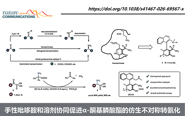 上海交通大学/上海师范大学赵宝国教授团队利用自主开发的手性吡哆胺催化剂,实现了α-酮膦酸酯的仿生不对称转氨化,以良好产率和高达98% ee的对映选择性高效构建一系列手性α-氨基膦酸酯,彰显维生素B6启发催化剂在不对称合成中的强大潜力。该方法优势显著:直接引入N-未保护氨基、高原子经济性、宽底物适用范围及优异的复杂分子兼容性。DFT支持的机理研究阐明,立体选择性源于三氟乙醇协同强化的氢键网络对关键过渡态的稳定作用,且1,3-质子迁移为决速步。此溶剂–催化剂协同机制精准复现了酶催化中的固有协同原理。