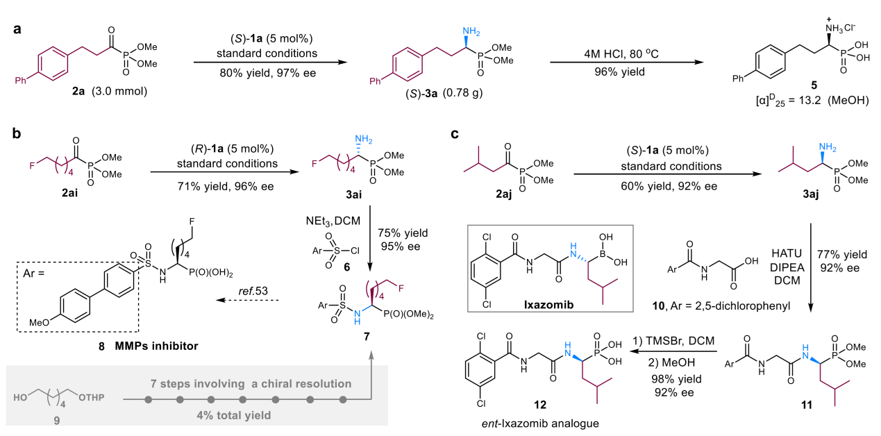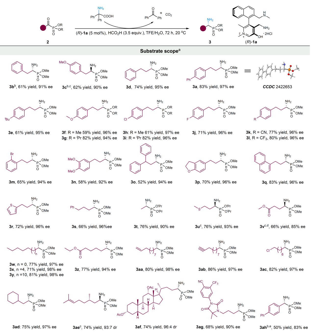 在最优条件下,作者对底物的兼容性进行了研究(Figure 2)。苄基与苯乙基取代的α-酮膦酸酯均顺利反应,以高对映选择性(92–98% ee)生成对应α-氨基膦酸酯3b–d。一系列含有不同取代基的苯乙基底物均可兼容(3e–n),如供电子基(3e, f, g, n)和缺电子基(3h–m)。异丙基膦酸酯(3f, 3h)、甲基膦酸酯(3g, 3i)、萘乙基(3q)与噻吩乙基(3r)、脂肪族α-酮膦酸酯(3t–af)等底物均可兼容。多种官能团(杂原子如3u、3ac;酯基, 如3v、3z;双键, 如3aa;炔键,如3ab;脂环如3ad)均耐受。含复杂结构的底物也可兼容,如香茅醛和脱氧胆酸衍生的α-酮膦酸酯(3ae, 3af)雄激素受体拮抗剂衍生的底物3ag等均可兼容。值得注意的是,多个产物与天然氨基酸结构对应:3b(苯丙氨酸)、3c(酪氨酸)、3t(丙氨酸)、3u(甲硫氨酸)、3v(谷氨酸),表明该方法适用于构建蛋白质源氨基酸的氨基膦酸酯类似物。异丙基及缬氨酸衍生的α-酮膦酸酯则不反应,可能源于β-位阻阻碍催化循环。