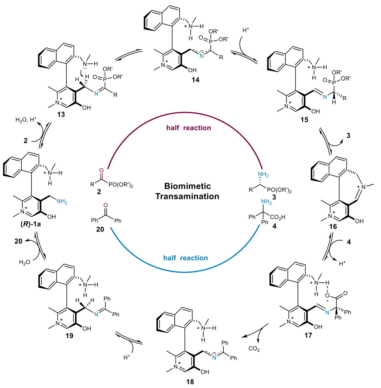 综上,作者提出了可能的反应机理(Figure 4)。即该反应遵循典型的吡哆胺催化转氨机制,模拟酶促转氨的两个半反应:第一半反应中,α-酮膦酸酯2与手性吡哆胺(R)-1a缩合形成席夫碱13,其1,3-质子迁移由催化剂内胺侧链促进;第二半反应中,二苯甘氨酸(4a)的氨基经席夫碱17/19异构化转移至内亚胺16,再生(R)-1a(图4)。尽管中间体14或18理论上可作为质子供体,但在含HCOOH、CF₃CH₂OH和H₂O的反应体系中,外部质子源介导或质子穿梭途径亦属合理。