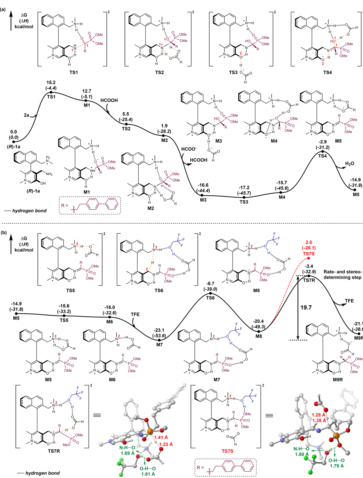 其次,作者对该反应的机理进行了研究(Figure 4-6)。即DFT计算表明(Figure 5):(R)-1a中的胺基亲核进攻2a,经TS1(ΔG‡ = 15.2 kcal/mol)生成M1;甲酸氢键网络协助下,质子经TS2从N1转移至O1,得M2;随后发生配体交换(甲酸解离、甲酸根与酚羟基配位),生成M3;经TS3质子由酚羟基转移至甲酸根,得M4;M4经C1–O1断裂与水消除(TS4)生成M5;再经TS5(N2→甲酸根质子转移)得M6;TFE进入并与侧链N2–H氢键结合,形成M7;侧链胺经TS6(ΔG‡ = 14.4 kcal/mol)对苄位C2–H脱质子,生成M8;最后,立体选择性质子化经TS7R(ΔG‡ = 19.7 kcal/mol)生成手性M9R,释放(R)-3a。竞争路径TS7S能垒更高(ΔG‡ = 25.1 kcal/mol),几何分析表明TS7R中N–H···O与O–H···O氢键距离更短,氢键网络稳定作用更强,故R路径具显著动力学优势。综上,TS7R质子化是首步半转氨的决速步与立体决定步。另外一方面,三氟乙醇在不对1,3-质子迁移过程中的作用研究表明(Figure 5):β位吸电子效应对立体诱导至关重要。DFT进一步显示:乙醇中TS7R/TS7S能垒差小于TFE中,与实验ee降低趋势一致。且TFE中TS7R的氢键更强(酸性溶剂增强甲酸根质子供体能力),从而提升对映选择性与催化活性;弱酸性醇则导致立体控制与效率下降。因此,TFE对实现高活性与高对映选择性具有决定性作用。