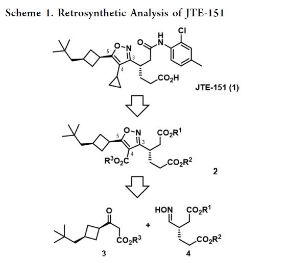近期,科学家发现了小分子 RORγ 抑制剂 JTE-151(1),并已推进至临床试验阶段。其中JTE-151是以异噁唑作为骨架核心,并在异噁唑的3-, 4-, 5-位含有手性己二酸单酰胺、环丙基和cis-3-新戊基环丁基(scheme 1)。目前,以采用1,3-偶极环加成作为主要策略合成此类化合物。即以β-酮酯3为亲合偶极体,与原位生成的手性腈氧化物(源自肟4)反应,可高区域选择性地构建5-位含3-新戊基环丁基、4-位含酯基的异噁唑骨架;随后通过脱羧、卤化及Suzuki–Miyaura偶联(环丙基硼酸),将4-位酯转化为环丙基。肟4含两个不同保护的羧基及邻近肟基的手性中心,合成难度大。近日,Japan Tobacco Inc.基于结晶诱导动态拆分(CIDR),报道了一种六步合成手性3-(羟基亚氨基)己二酸4的实用路线。该中间体经1,3-偶极环加成构建异噁唑环,再经Ag2O催化脱羧,直接得到异噁唑23——ROR-γ抑制剂JTE-151的API起始物料。