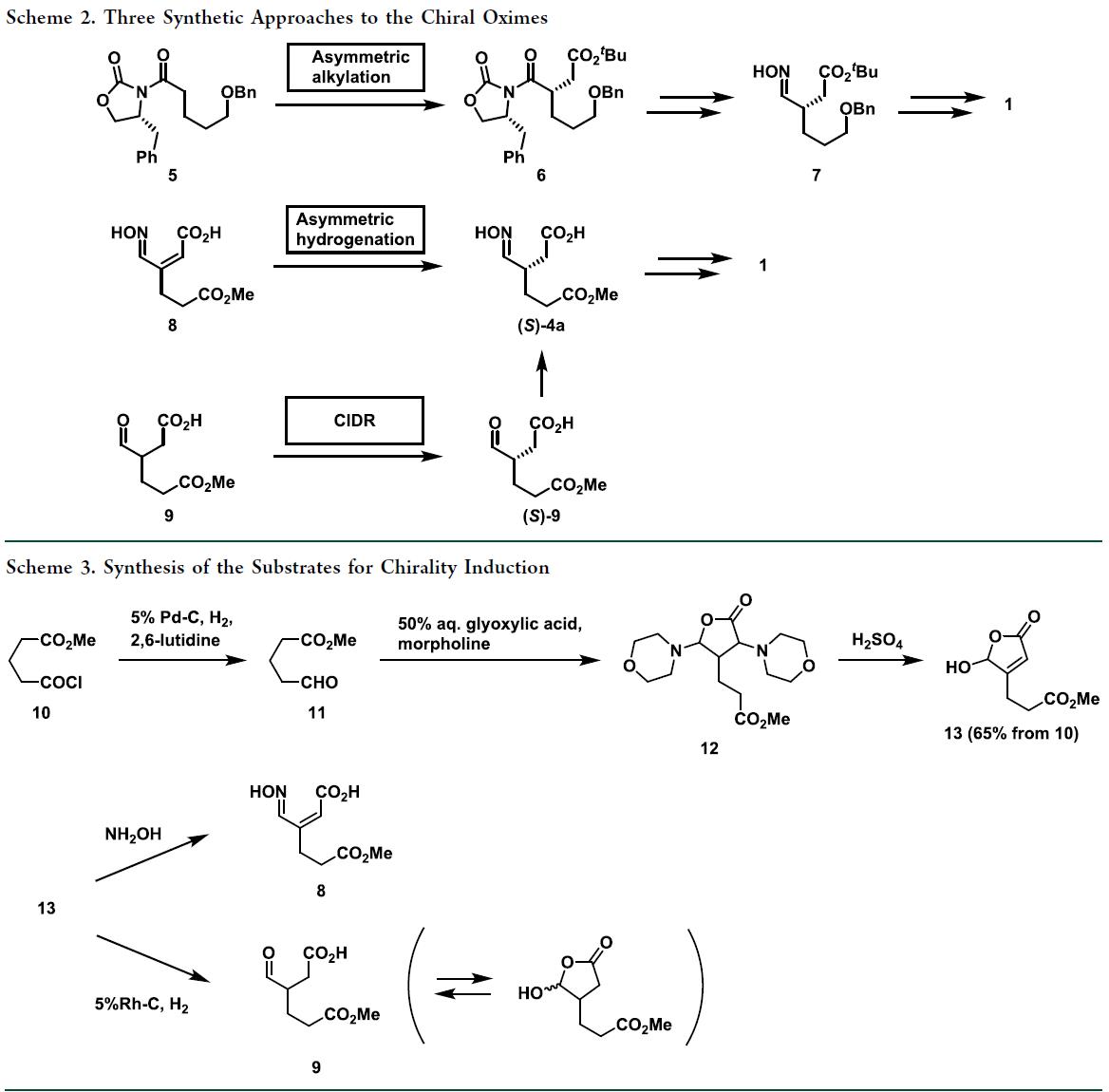 进入中后期开发后,亟需更简短、经济的(S)-4合成路线,避免低温操作与色谱纯化。因此,作者转向催化不对称氢化与CIDR,并设计底物含两个差异化羧基及一个肟基或醛基,从而全程规避氧化/还原步骤。据此,α,β-不饱和酸8(用于氢化)和醛9(用于CIDR)被选定为目标底物,二者均源自共同前体13(scheme 3)。
