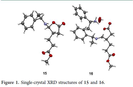 其次,9与等量(S)-1-苯乙胺(14)在室温下于己烷/乙酸乙酯中混合,直接析出γ-氨基-γ-丁内酯15的单一晶型晶体,产率66%(scheme 4)。单晶X射线分析确认其结构(Figure 1),且14的手性同步控制15中β-与γ-位两个立体中心。然而,15经盐酸羟胺室温处理后,虽1H NMR显示其为非对映体纯,却仅以91% ee得到非目标(R)-4a,表明转化过程中发生部分消旋。改用2 equiv 14进行CIDR,则高产率(92%)获得新型晶体16。X射线证实其为亚胺盐结构(Figure 1),且经硫酸羟胺处理,可在70 g规模以96% ee直接制得目标(S)-4a。值得注意的是:仅通过调控14的用量(1 vs. 2 equiv),即可选择性获得(R)-或(S)-4a——同一手性胺实现构型翻转。该转化需将固体16分批加入略过量的硫酸羟胺水/乙腈溶液;反向加料会导致光学纯度显著下降。反应完成后,加入等量硫酸,使14以硫酸盐形式定量沉淀。过滤即回收>95%的14(以硫酸盐计)。
