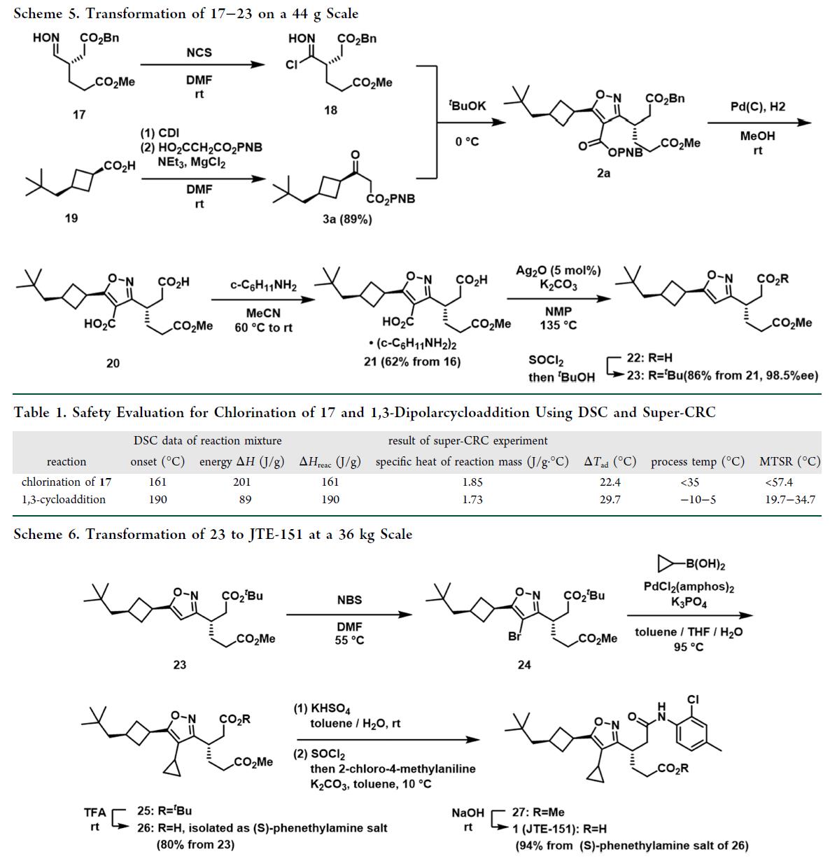 最后,17 至 JTE-151 API 起始物料(23)的转化包含两个关键步骤(scheme 5):(1)与β-酮酯3a(由19以89%收率制得,无异构化)发生1,3-偶极环加成,构建异噁唑核心;(2)选择性脱除异噁唑4位引入的羧基。该环加成采用一锅法(Table 1):17经NCS氯化生成氯肟18,随即在t-BuOK/3a作用下原位产生腈氧化物,并被3a烯醇盐高效捕获,直接形成异噁唑。粗产物2a经Pd/C氢解脱除苄基与4-硝基苄基,所得二酸20以环己胺盐21形式结晶纯化(收率62%,以16计)。脱羧步骤采用Gooßen条件(5 mol% Ag₂O、10 mol% K₂CO₃,NMP,135 °C),实现20高选择性转化为单酸22。22经SOCl₂转化为酰氯后,与t-BuOH酯化得叔丁酯23——JTE-151的API起始物料候选物。粗品23经活性炭脱色、水/2-丙醇重结晶,获得高纯度产物(HPLC纯度98.99%,ee 98.5%),收率86%(以21计)。 23的纯度与前期通过不对称烷基化路线(scheme 2)制备的23相当;后者已成功用于36 kg级JTE-151临床样品合成,总收率75%(scheme 6)。