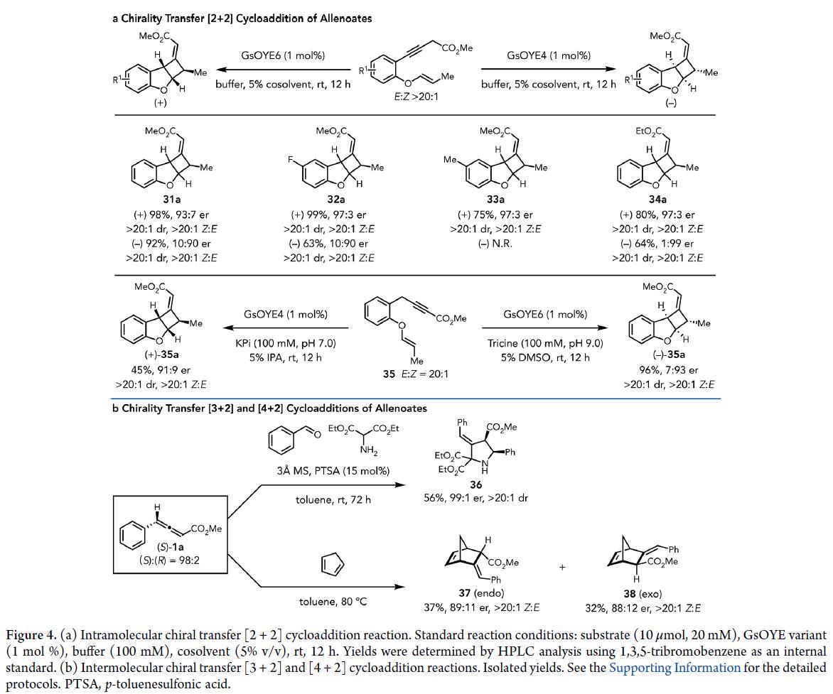 其次,对于苯环带有烯烃的底物时,该催化体系可引发一种自发的分子内[2 + 2]环加成,从而以优秀的产率,优异的对映和非对映选择性获得相应的苯并呋喃衍生物(Figure 4a)。同时,(S)-1a 可与苯甲醛和胺原位缩合形成的亚胺发生分子间[3 + 2]环加成反应(Figure 4b),进一步展示手性联烯酸酯在合成方面的潜力。此外(S)-1a 与环戊二烯顺利发生分子间[4 + 2]环加成(狄尔斯-阿尔德反应),有效地生成了相应的endo-37 和exo-38 双环[2.2.1]庚烯衍生物(Figure 4b)。