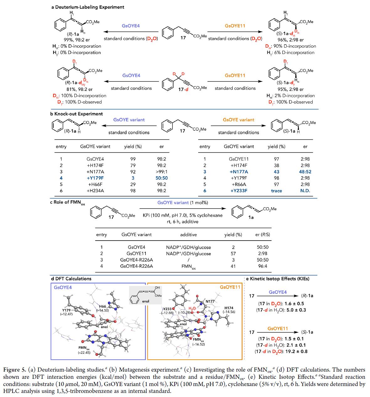 接下来,作者通过一系列实验对反应机理进行研究。该反应可通过两种机制发生:即1)单碱机制(one-base mechanism):单个活性位点残基同时充当广义碱和酸。在反应过程中,17 的γ位质子转移到α位,与缓冲溶液的质子交换不显著;2)双碱机制(two-base mechanism):两个活性位点残基分别充当广义碱和酸。质子转移过程中,α位质子最终源自缓冲液。17的氘代实验表明(Figure 5a):GsOYE4 通过单碱基机制形成(R)-对映体,而 GsOYE11 则通过双碱基机制提供(S)-对映体。另外一方面,作者通过定向进化鉴定催化中起酸/碱作用的活性位点残基(Figure 5b)。结果表明: GsOYE4的Y179,以及GsOYE11的Y233和N177为关键残基;而GsOYE4-H66F和GsOYE11-H174F突变导致活性显著下降。此外,对反应后回收的酶进行HRMS分析表明,GsOYE4和GsOYE11分别有45%和18%被底物1a共价修饰。进一步通过四极杆-轨道阱质谱定位到GsOYE4-H66和GsOYE11-Y233为最高概率修饰位点,证实二者紧邻1a的亲电中心,从而证明二者在催化过程中起着重要作用。