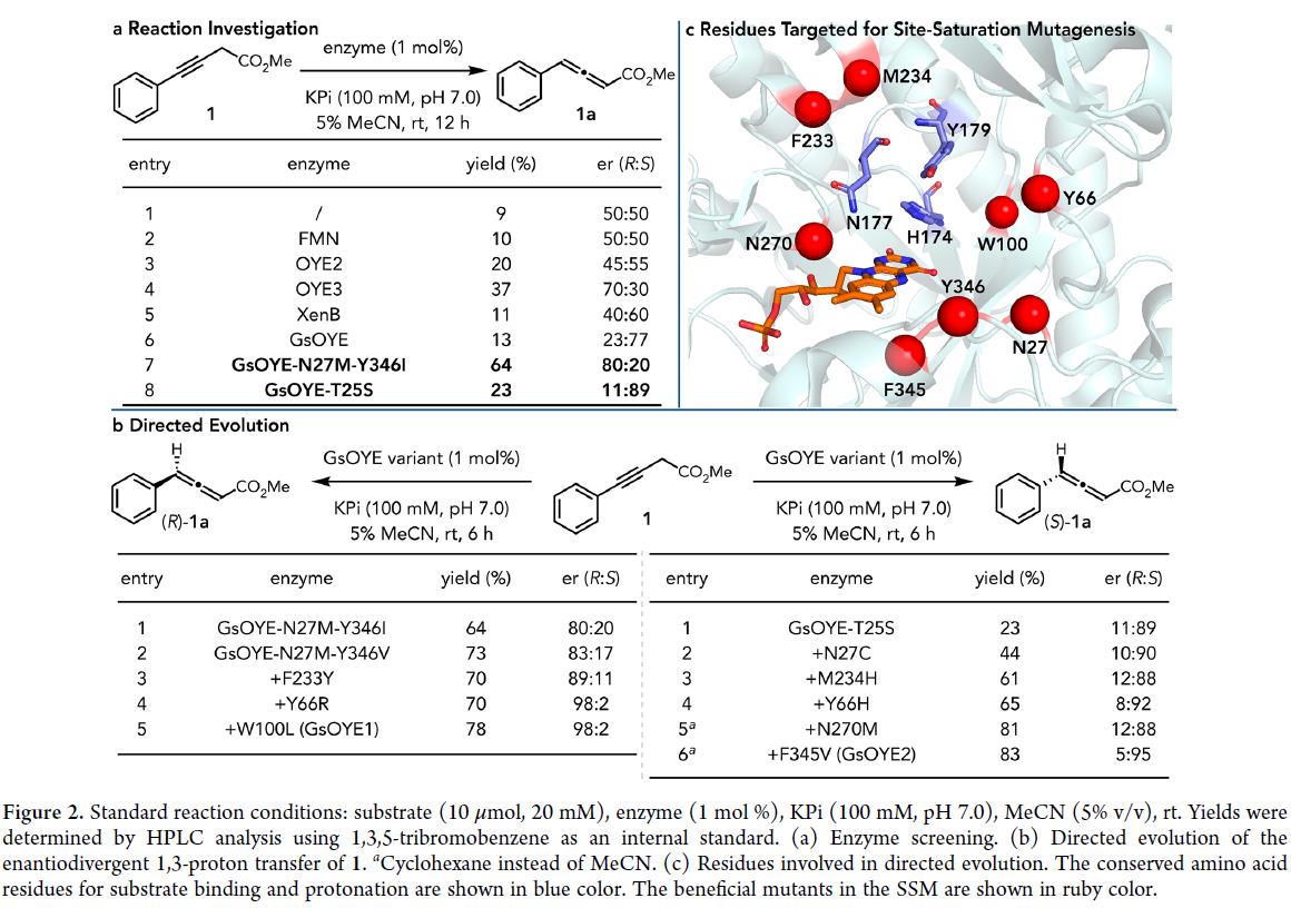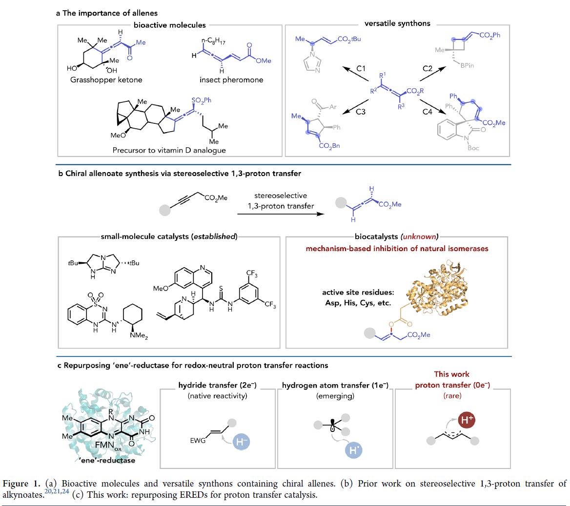 手性联烯酸酯是广泛用于制药、农药和材料等领域的重要手性砌块。其独特反应性源于活化的累积双键体系(即正交排列的共轭π系统),赋予其高亲电性与轴向手性特征,因而可作为构建复杂立体分子的合成子。其中,轴向手性向中心手性的转移反应(Figure 1a)能一步构建含多个立体中心的复杂骨架,因而其备受关注。目前,通过炔丙基1,3-质子转移的对映选择性异构化,成功将非手性炔酸酯的α-质子立体选择性地迁移至γ-位,进而为构建手性联烯酸酯提供是一条简洁高效的合成路径。尽管手性小分子碱催化剂已实现该转化(图1b),但酶催化凭借操作简便、易于规模化制备和可定向进化等优势,使得该策略为手性联烯酸酯的的绿色合成及合成生物学应用提供更具潜力的新途径。