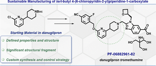 活性药物成分(API)起始物料(SM)是用于合成 API 分子的关键化合物。Tert-butyl 4-(6-chloropyridin-2-yl)piperidine-1-carboxylate (1)是合成GLP-1激动剂Danuglipron的关键片段,用于Pfizer开发2型糖尿病及减肥治疗药物。该分子构成Danuglipron的核心骨架:吡啶环2位连有N-Boc保护的哌啶,便于氮原子后续修饰;6位为氯原子,支持该位点官能化。鉴于临床需求量大,因此需要一种能够提供多吨级产量的工艺。