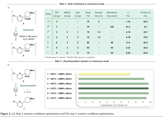 Step 3脱羧原在间歇工艺中使用iPrOAc作溶剂(起始物料为分离所得酸5)。为规避连续流程中低效的溶剂切换,直接沿用步骤2的甲醇/THF体系。Figure 3b显示:该体系在宽温度范围内稳健,最终选定110 °C、80 min停留时间、1.5 MPa反应压力(Figure 3b,entry 4)。