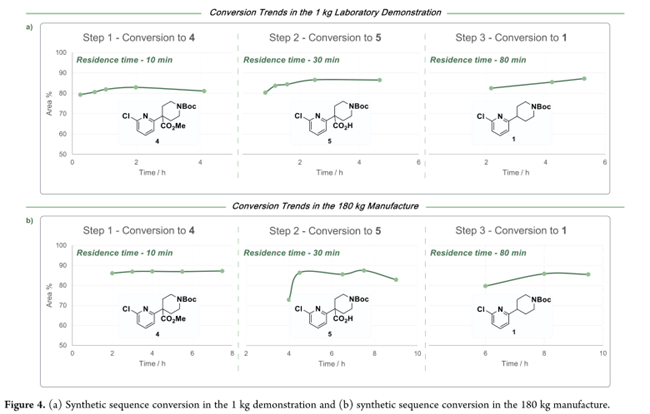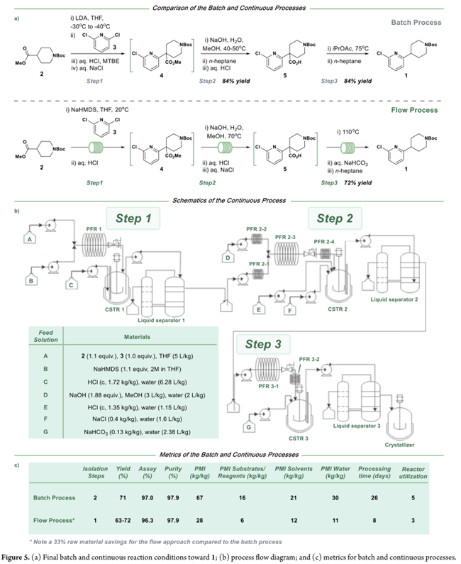 经系统优化,确立三步串联连续工艺:第一步以NaHMDS为碱,在20 °C下使N-Boc-哌啶-4-甲酸酯(2)烯醇化,并与2,6-二氯吡啶(3)反应10 min;淬灭分液后,有机相直接进入第二步——70 °C下与NaOH/甲醇水溶液在管式反应器中皂化30 min(转化率85%);随后于CSTR中用盐酸酸化并加入20% NaCl水溶液促相分离,得羧酸5;第三步为110 °C管式反应器中热脱羧。最终,有机相经正庚烷溶剂置换、结晶、过滤及干燥,获得化合物1。实验室完成1 kg示范实验(Figure 4a),三步转化率高度稳定,收率72%,纯度>98%。后续开展180 kg级生产:投料142.2 kg原料3,全程中间体4转化率稳定在87%(Figure 4b)。实际得188.5 kg产物1;收率略低于理论值,主因是系统达到稳态所需时间占比较高。Figure 5c显示:连续工艺总体PMI降至28 kg/kg,不足间歇工艺(67 kg/kg)的50%,且原材料、溶剂与水耗显著降低。