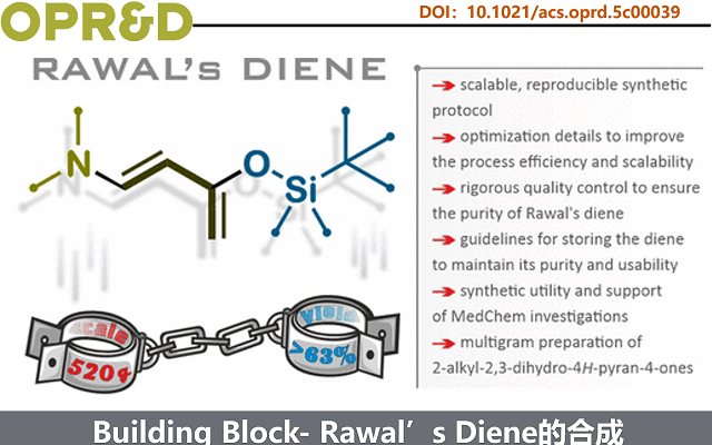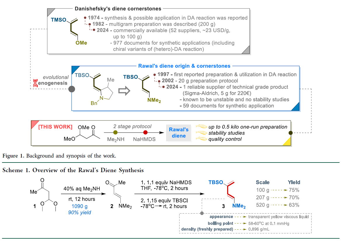 目前,Rawal’s二烯的应用渐增,但仍远少于Danishefsky’s二烯,仅有Sigma-Aldrich可稳定供货。且现有反应多限于毫摩尔尺度,难以满足工艺开发需求。根本制约在于缺乏百克级制备能力:迄今最大单批报道量仅20.4 g;即便放大,其固有稳定性差仍是商业化的主要障碍。Taras Shevchenko National University of Kyiv大学的科学家聚焦三大突破:(1)建立稳健、可放大的百克级合成工艺,并明确关键工艺参数;(2)制定配套质量控制标准;(3)系统考察其在温度、湿度、光照及储存时间等条件下的稳定性。由此形成可直接指导储存、运输与使用的操作规范,显著提升其在研发与生产中的可靠性与可及性。
